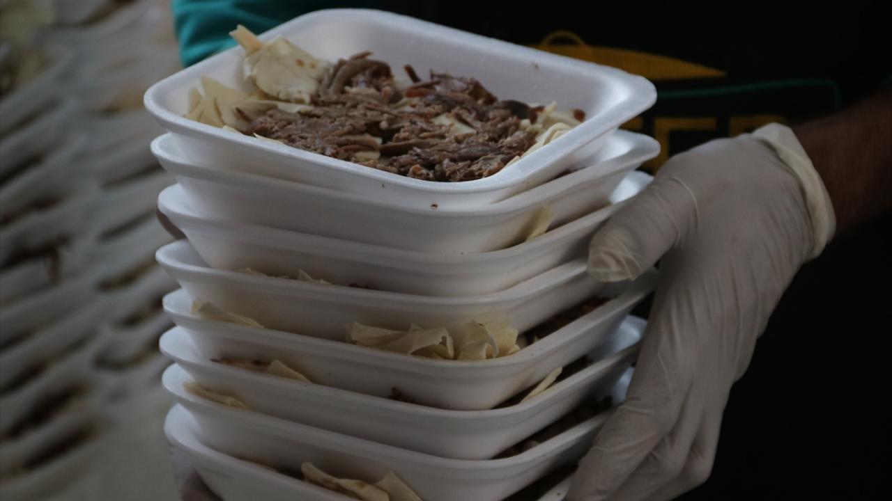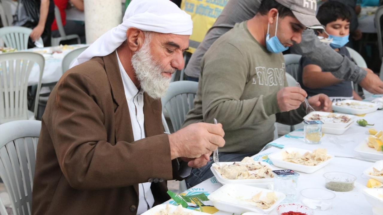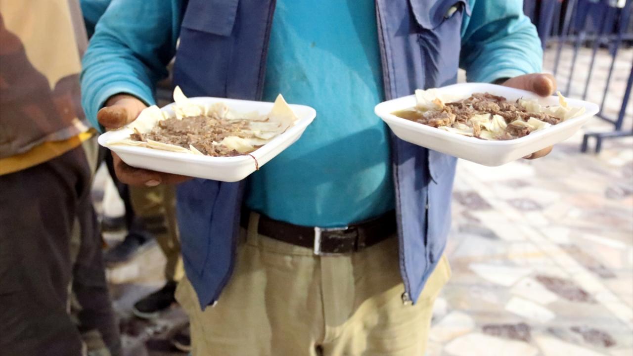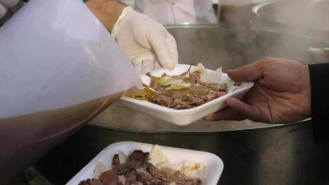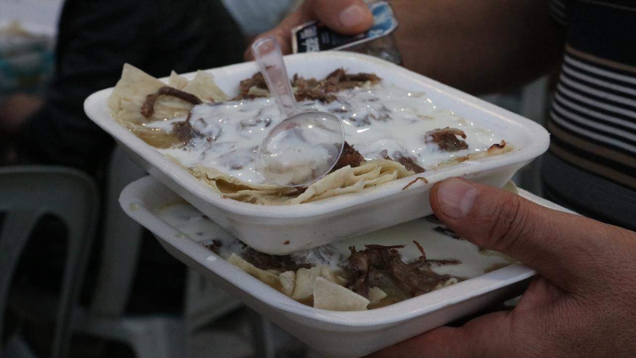 Görevliler tarafından dağıtılan tiriti alanlar, kendileri için hazırlanan masalarda yemeği yedi.