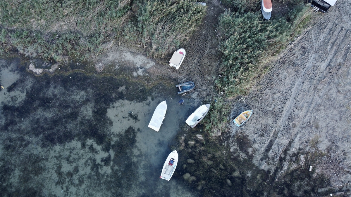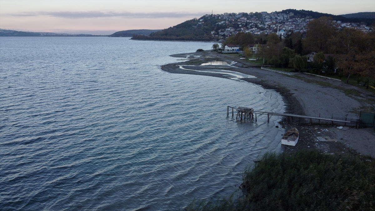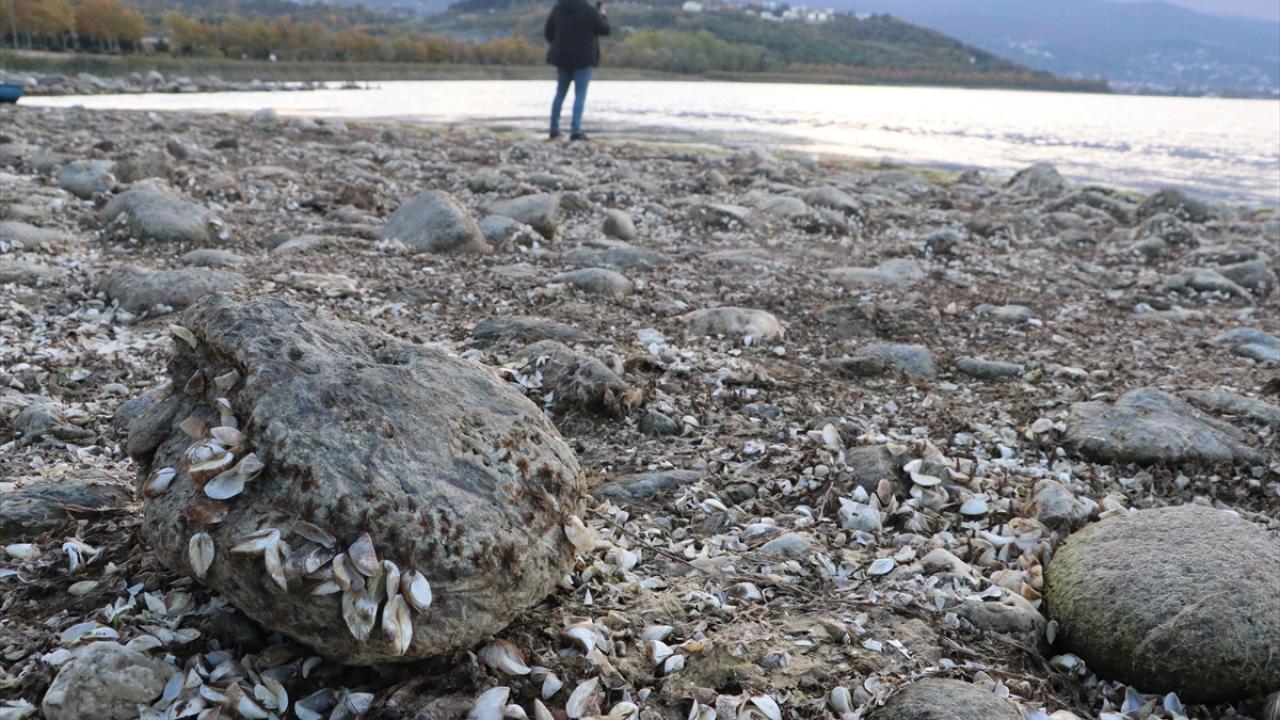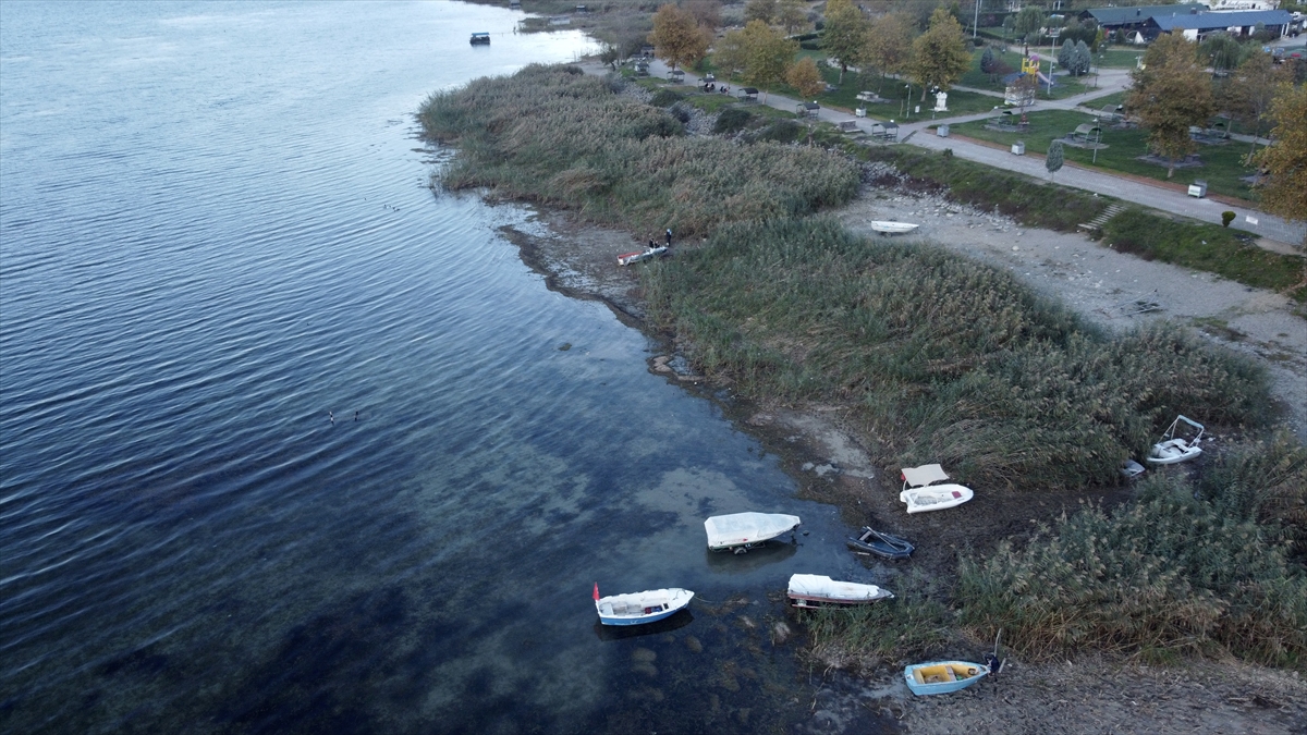Göl havzası kıyıdan yaklaşık 18 metre çekilirken, kıyıda deniz kabukları görüldü, susuz kalan bazı sazlıklar kuruma riskiyle karşı karşıya kaldı.