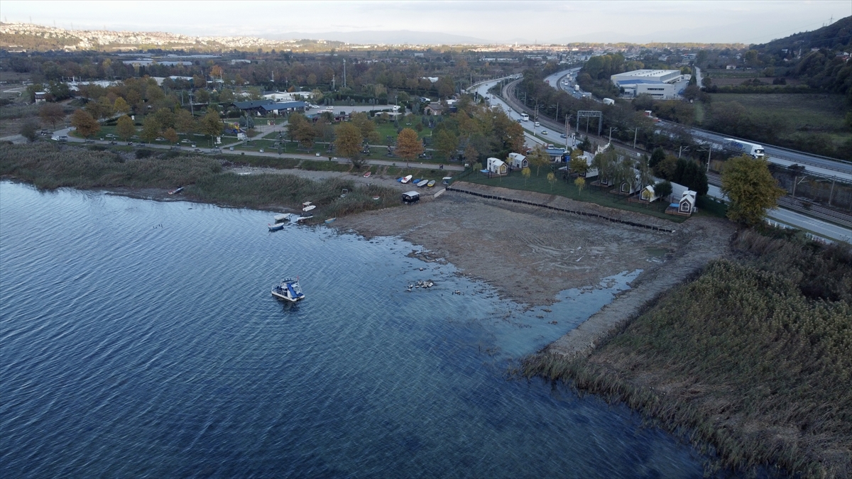 Sapanca Gölü`nde kuraklığın etkili olduğu alanlar, dronla görüntülendi.