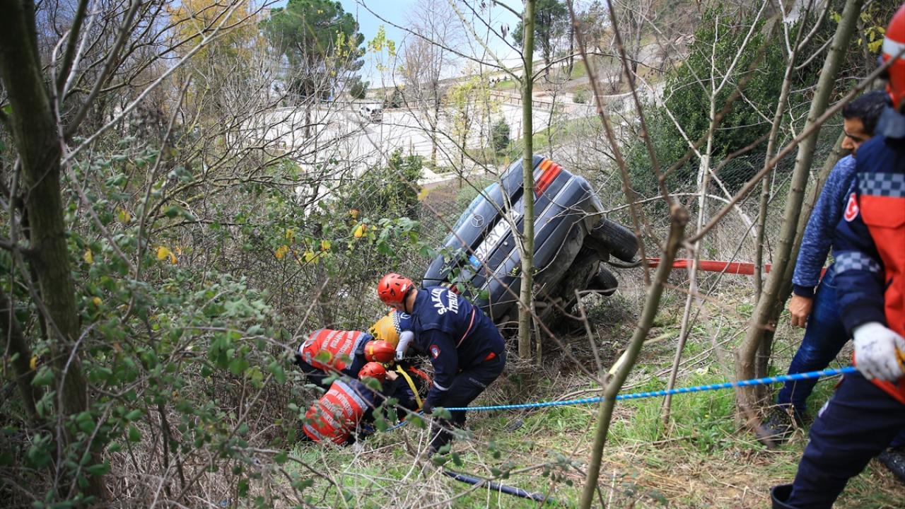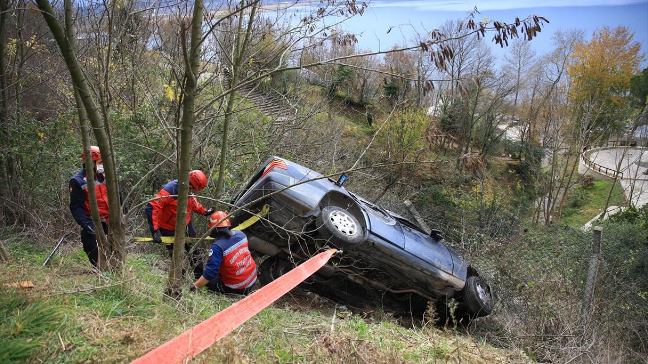 Şarampole devrilen otomobil tel örgü sayesinde kurtuldu