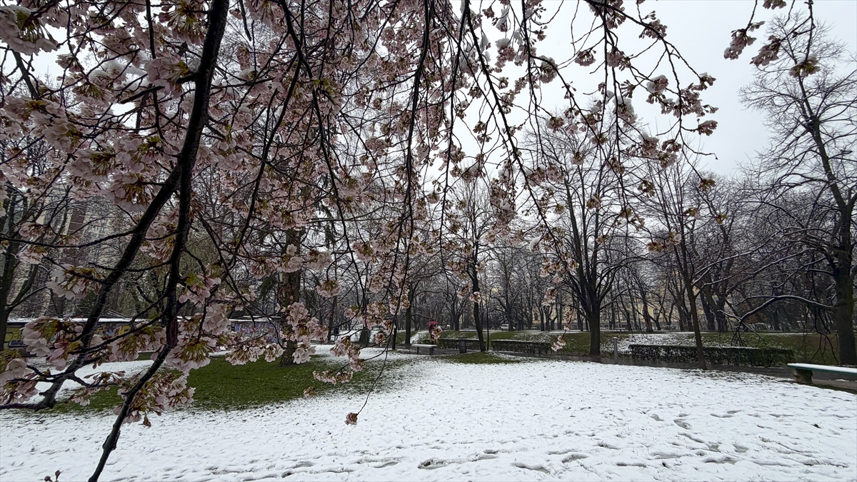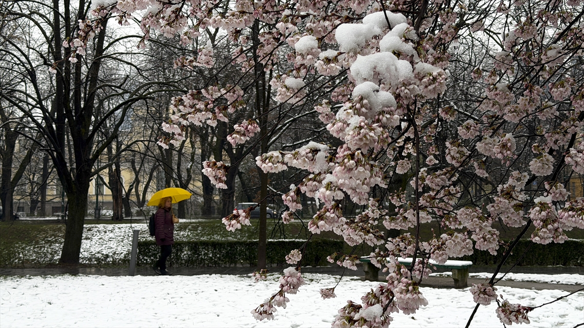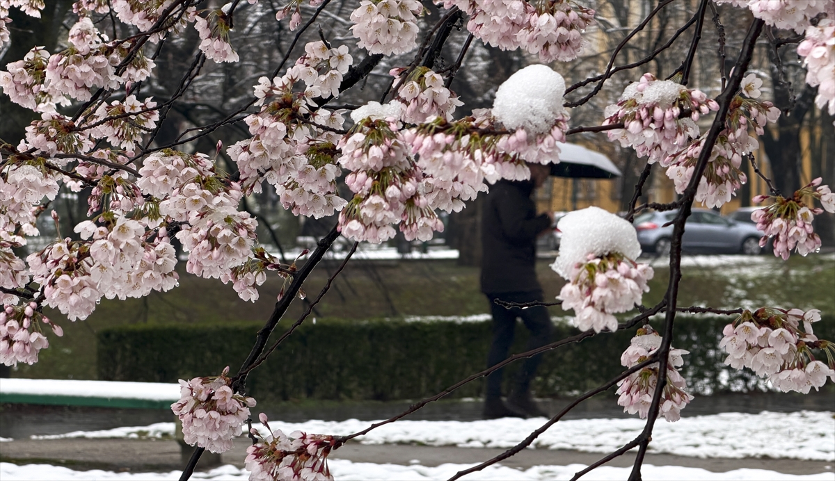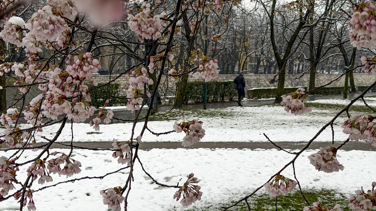 Bosna Hersek'in başkenti Saraybosna’da etkili olan beklenmedik kar yağışı, yeni çiçek açan ağaçların dallarını ve kentin yeşil alanlarını beyaz örtüyle kapladı.