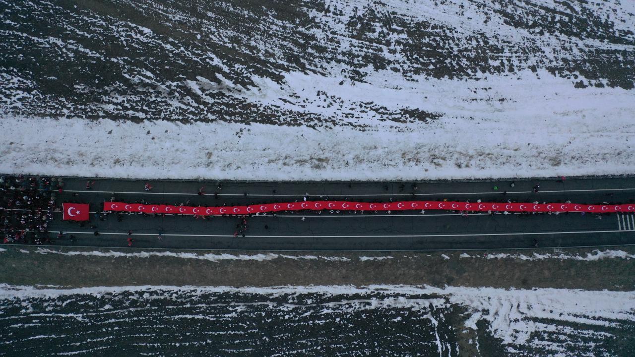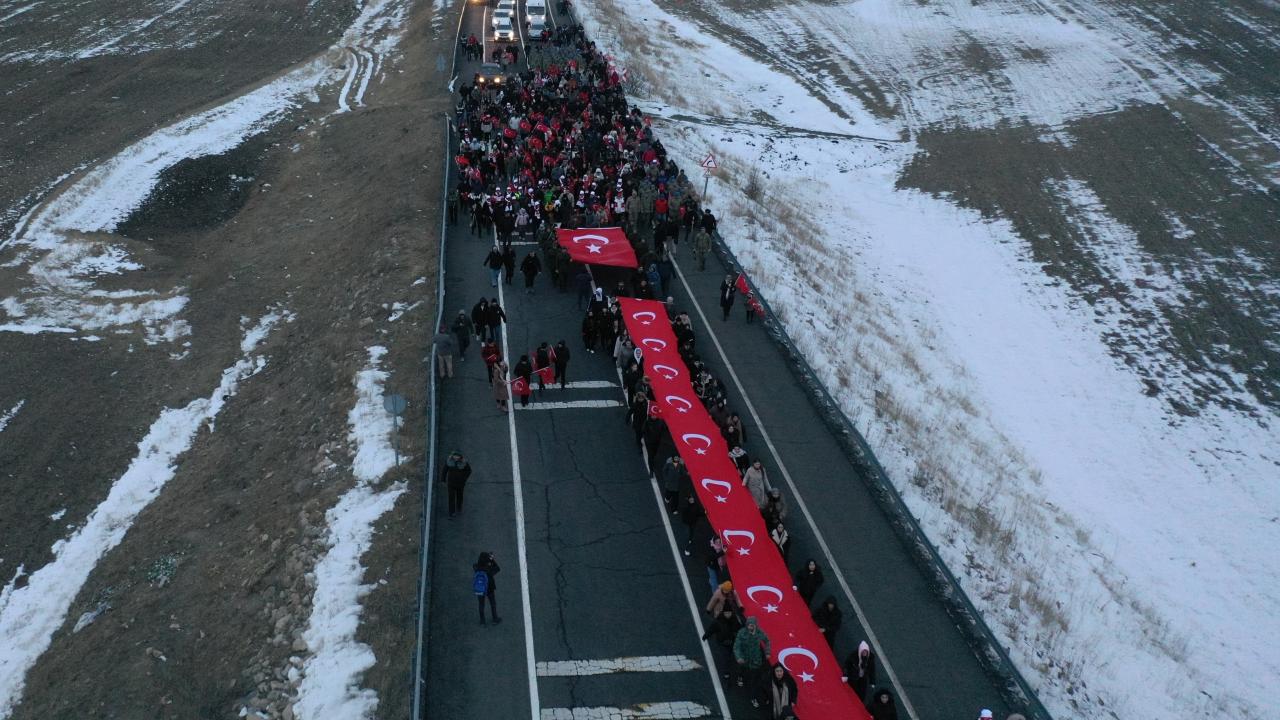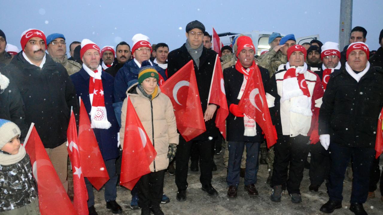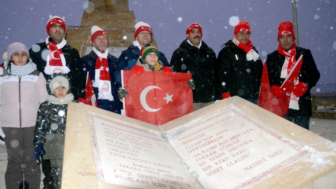 Karlı ve soğuk havaya aldırış etmeyen katılımcılar, şehitlikte saygı duruşunda bulundu, İstiklal Marşı`nı okudu.