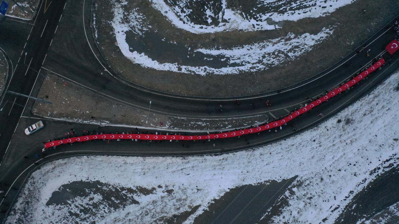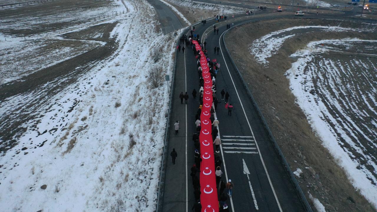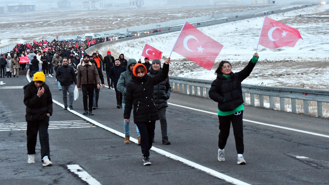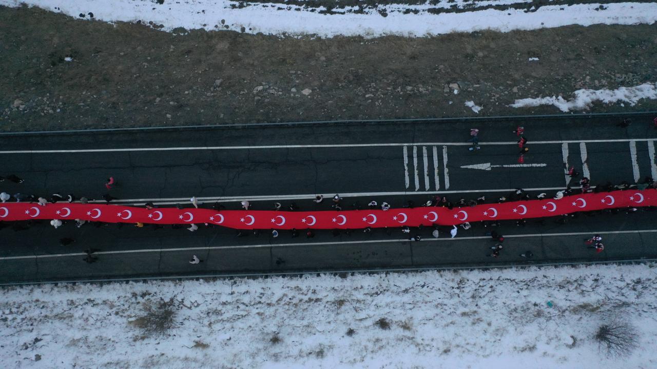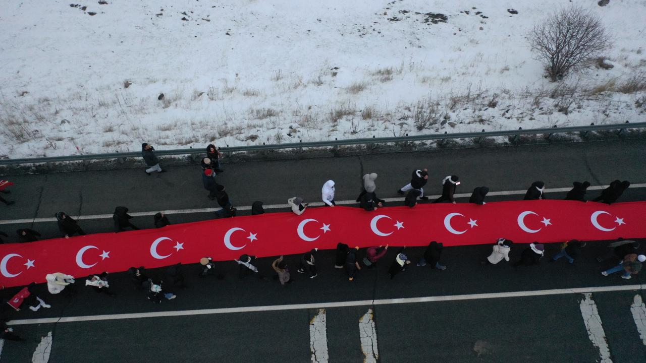 Karlı ve soğuk havaya aldırış etmeyen katılımcılar, şehitlikte saygı duruşunda bulundu, İstiklal Marşı`nı okudu.