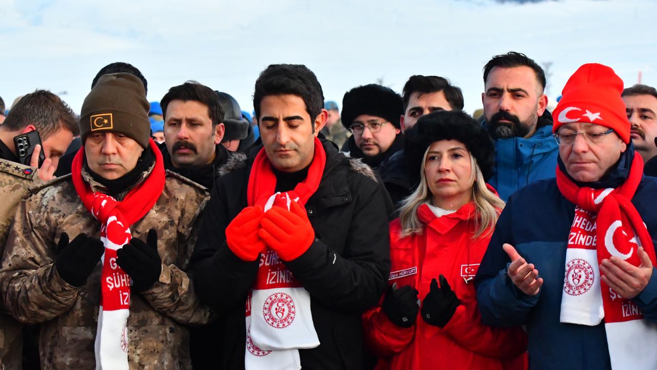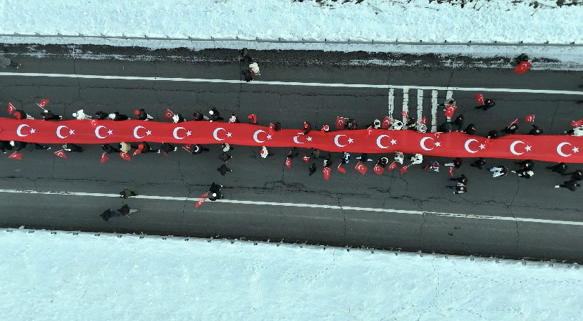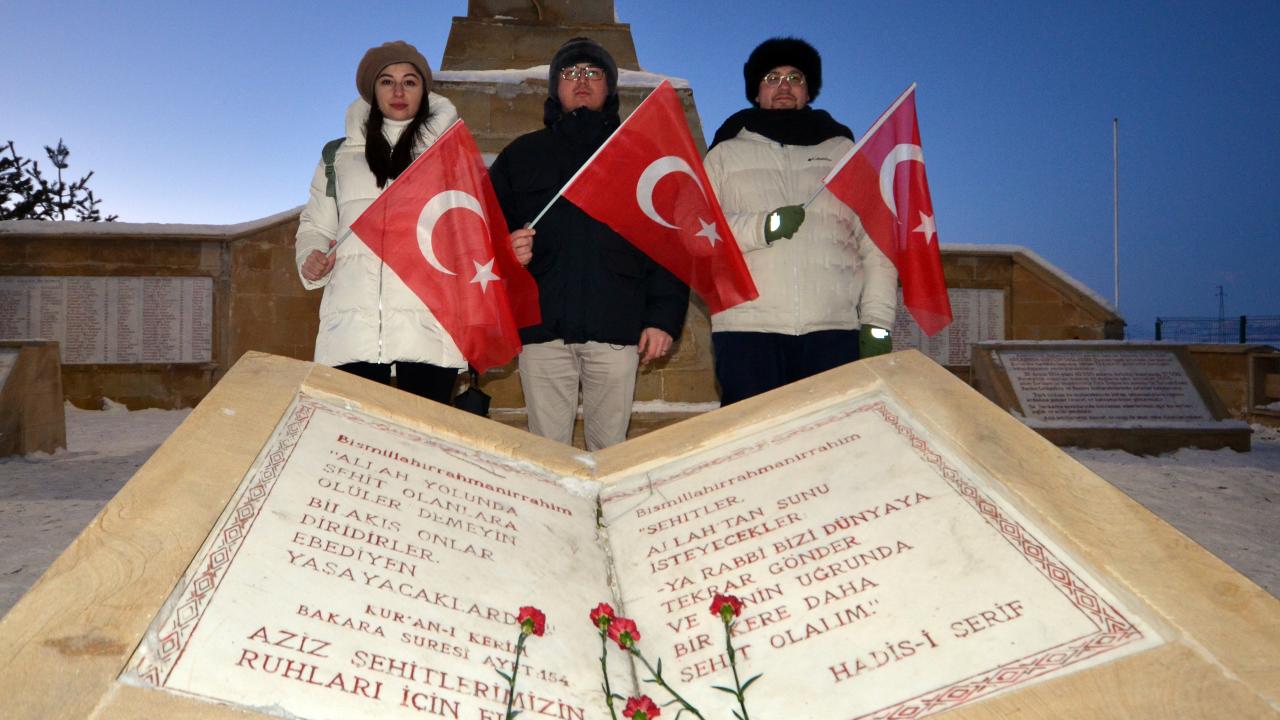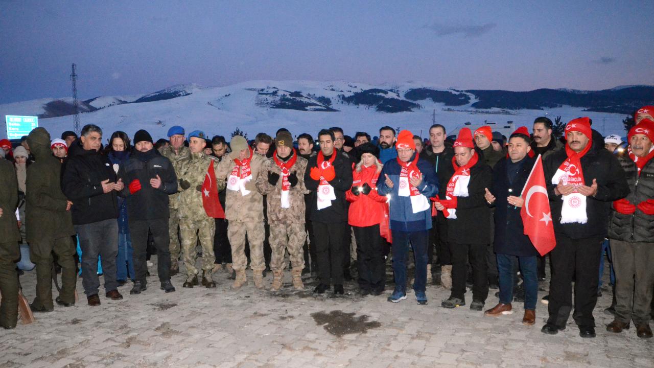 Soğuk havaya aldırış etmeyen katılımcılar, şehitlikte saygı duruşunda bulundu, İstiklal Marşı`nı okudu.
