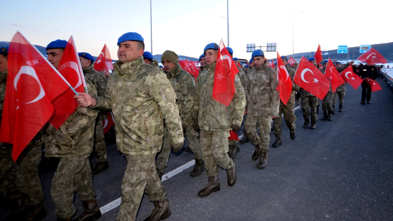Asker kıyafeti giyerek ilçe merkezinde toplanan vatandaşlar, Türk bayrakları ve meşaleler eşliğinde Alisofu Şehitlik Anıtı`na kadar yaklaşık 3 kilometre yürüyüş yaptı.