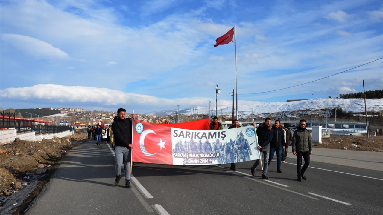 Öğrenci ve katılımcılar yaklaşık 3 kilometre yürüdükten sonra Yukarı Sarıkamış Şehitliği`ne ulaştı. Burada saygı duruşunda bulunuldu ve İstiklal Marşı söylendi. Şehitler için Kur`an-ı Kerim okunarak, dua edildi.