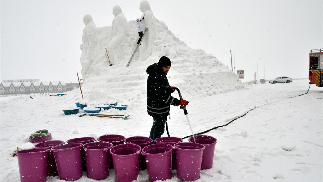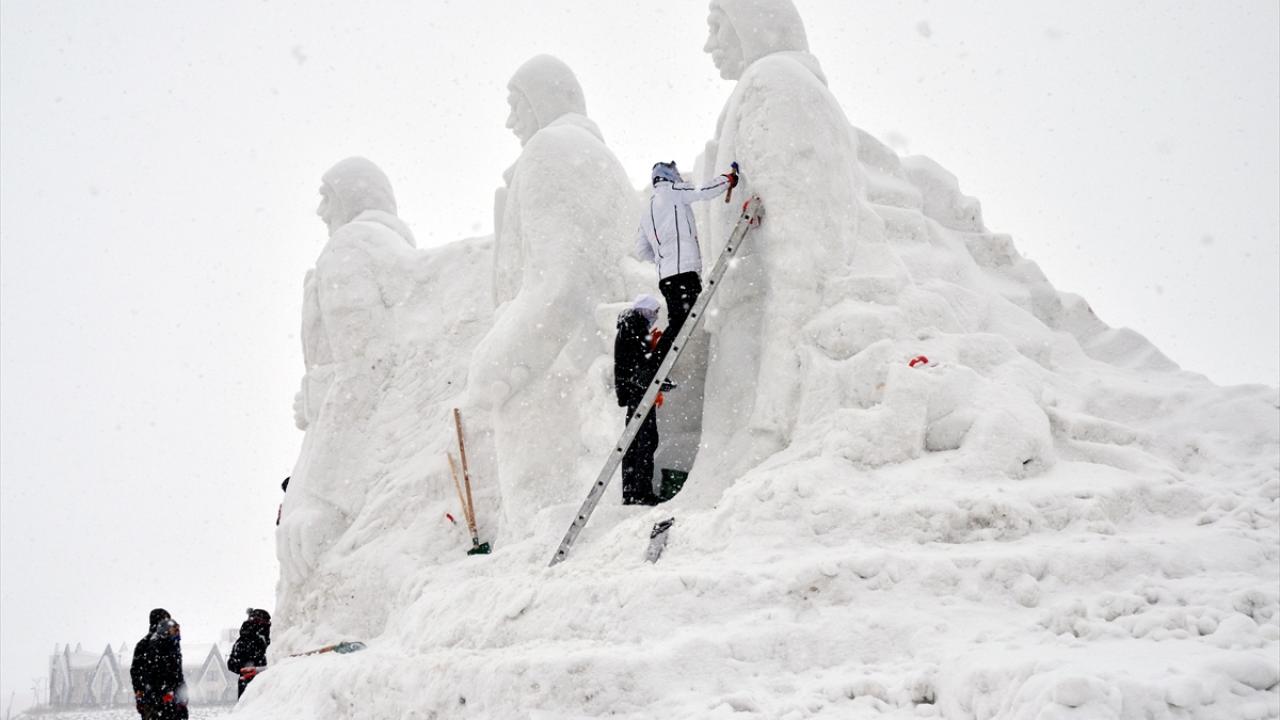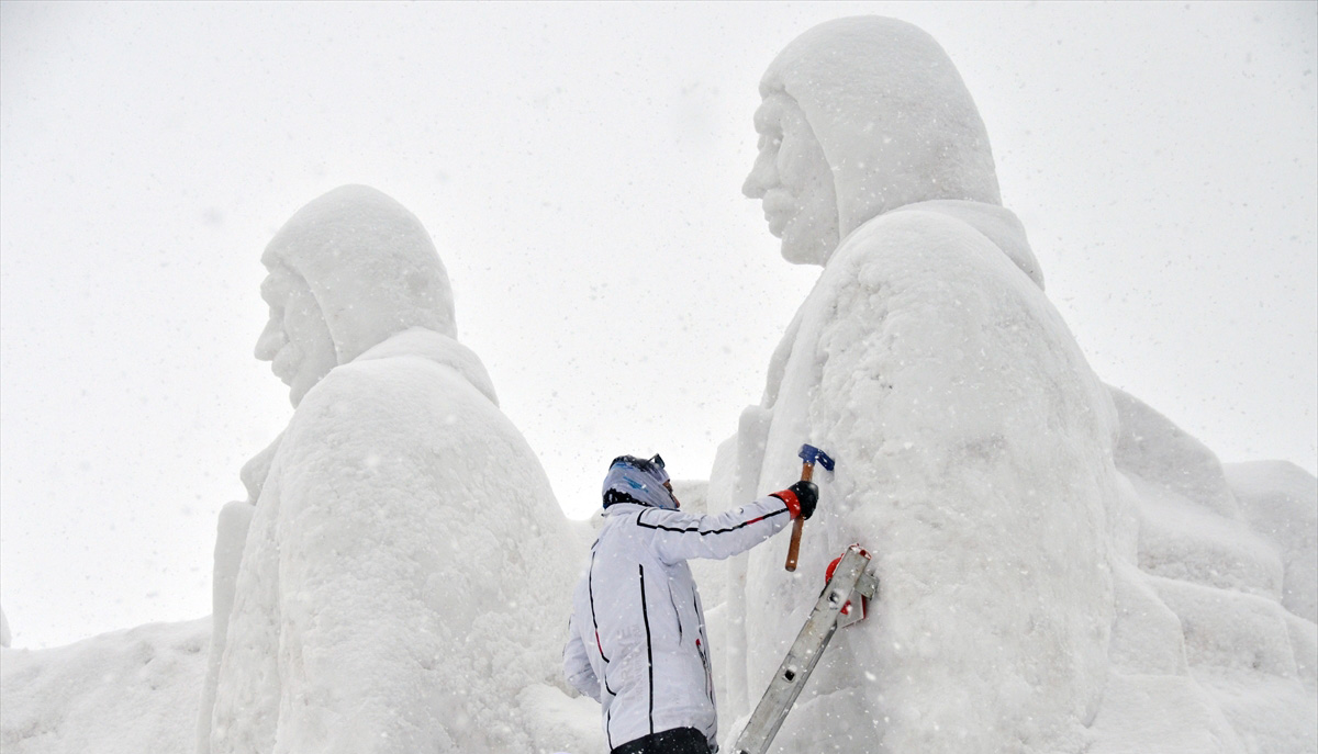 Oteller bölgesindeki kardan heykellere kar yağışı altında son rötuşlar yapıldı.