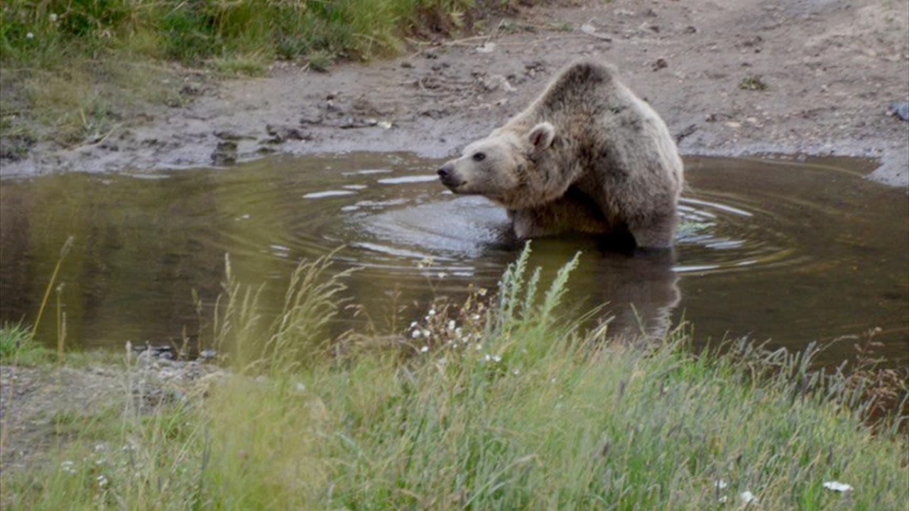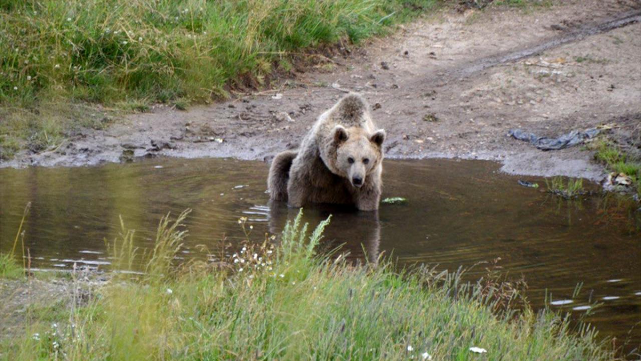 Hava sıcaklığının mevsim normallerinin üzerinde seyrettiği bölgede sıcaktan bunalan anne bozayı, daha sonra buradaki bir küçük su birikintisine girerek serinlemeye çalıştı.
