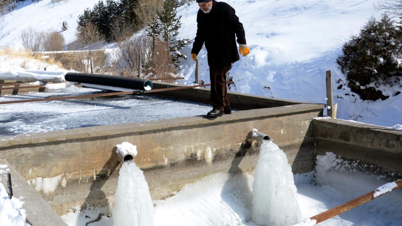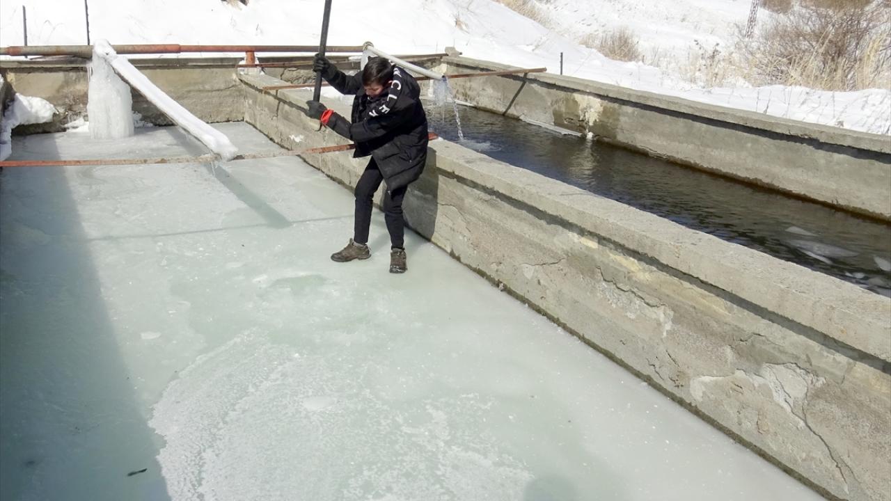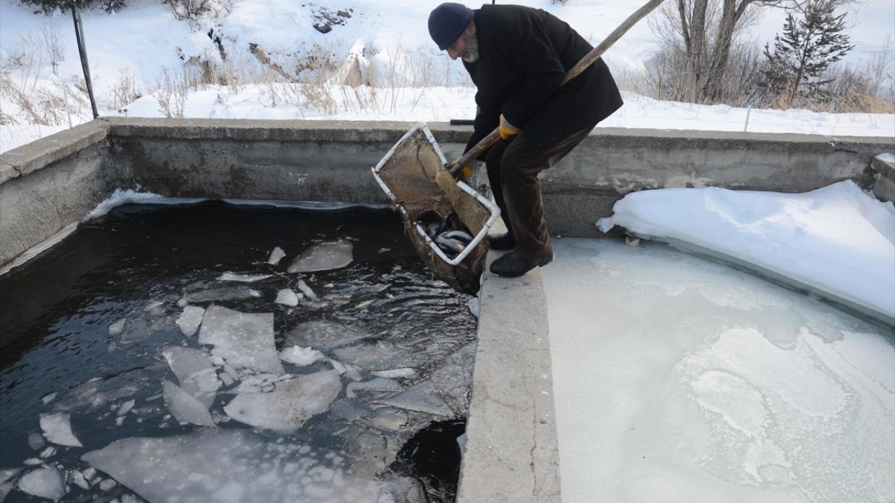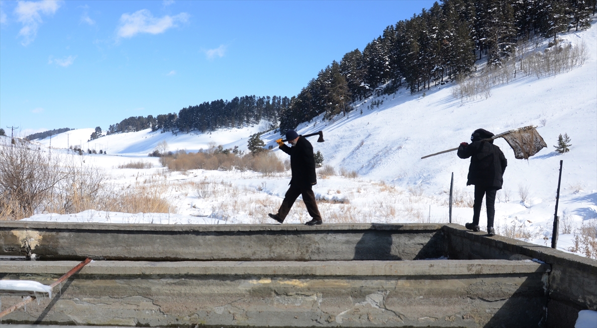 Hava sıcaklığının zaman zaman sıfırın altında 30 dereceye kadar düştüğü ilçede, kültür alabalığı üreticileri buzla kaplı havuzlarda üretim yapıyor.