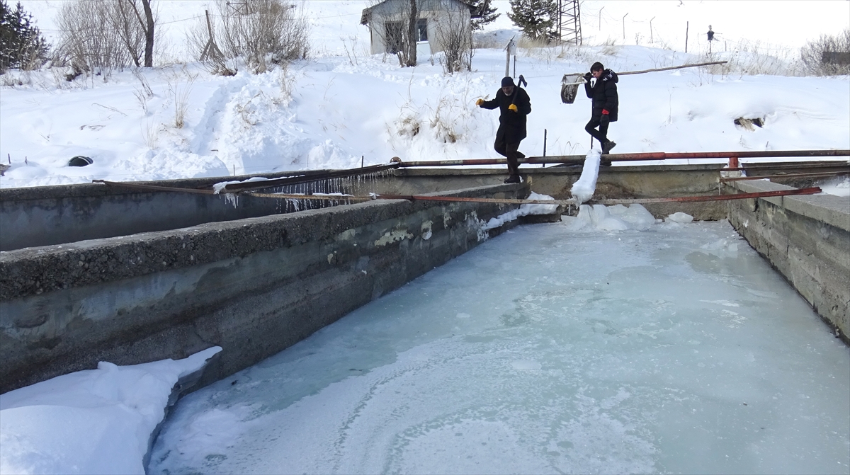 Sarıkamış ilçe merkezine 10 kilometre uzaklıkta bulunan Keklik Deresi mevkisindeki kültür alabalığı üretim tesisindeki havuzlarda buz kalınlığı 10 santimetreyi geçiyor.