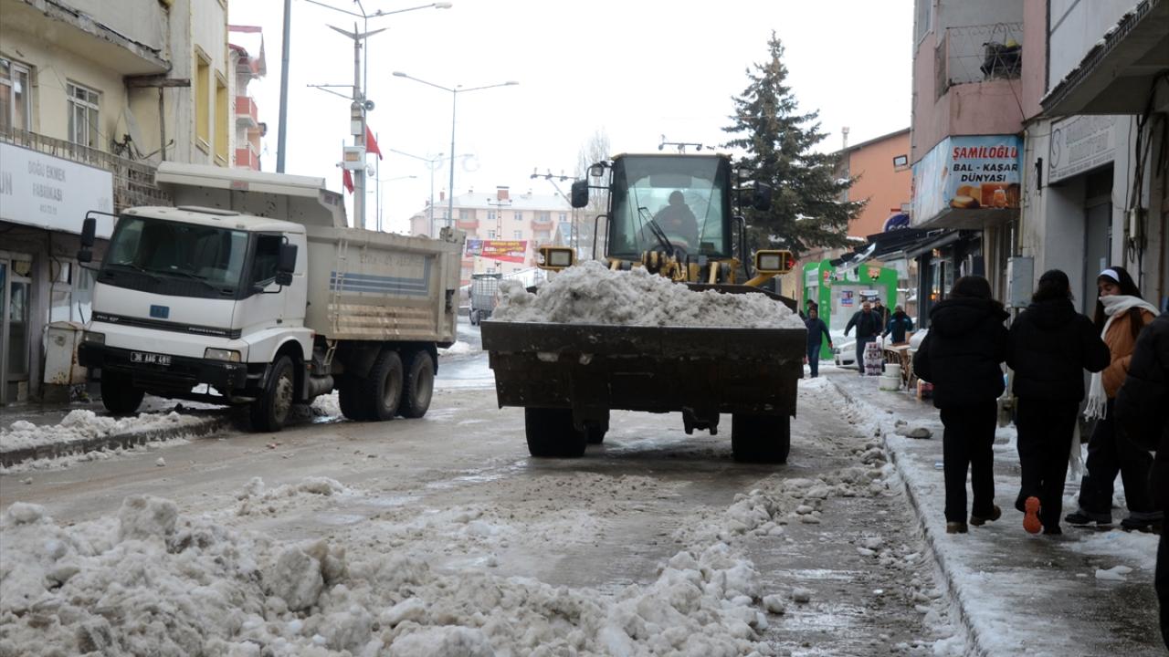 Ekipler, iş makineleriyle cadde ve sokaklardaki karları kamyonlara yükleyip ilçe dışına taşıyor.
