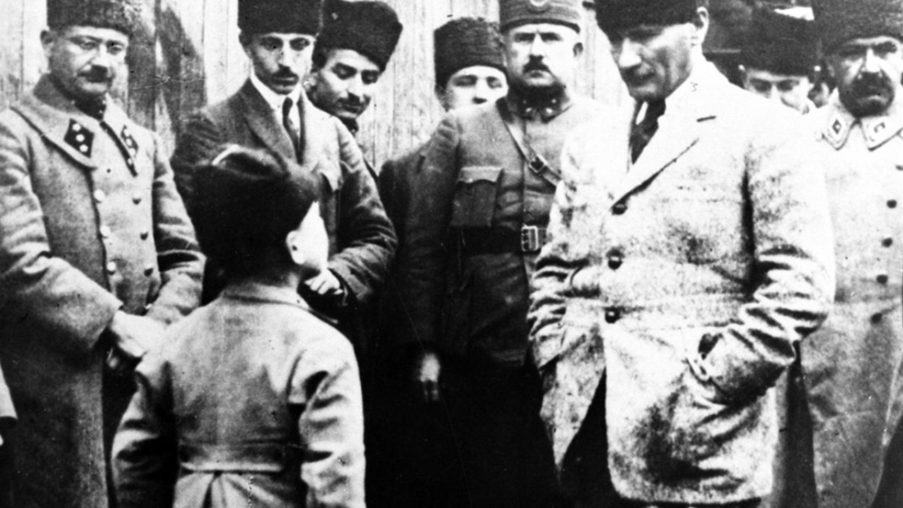 16 Ocak 1923`de Mustafa Kemal Atatürk (sağda), yurt gezisi sırasında uğradığı Osmaneli İstasyonu`nda bir öğrencinin okuduğu şiiri dinliyor. Mareşal Fevzi Çakmak (arkada sağda). (Arşiv)