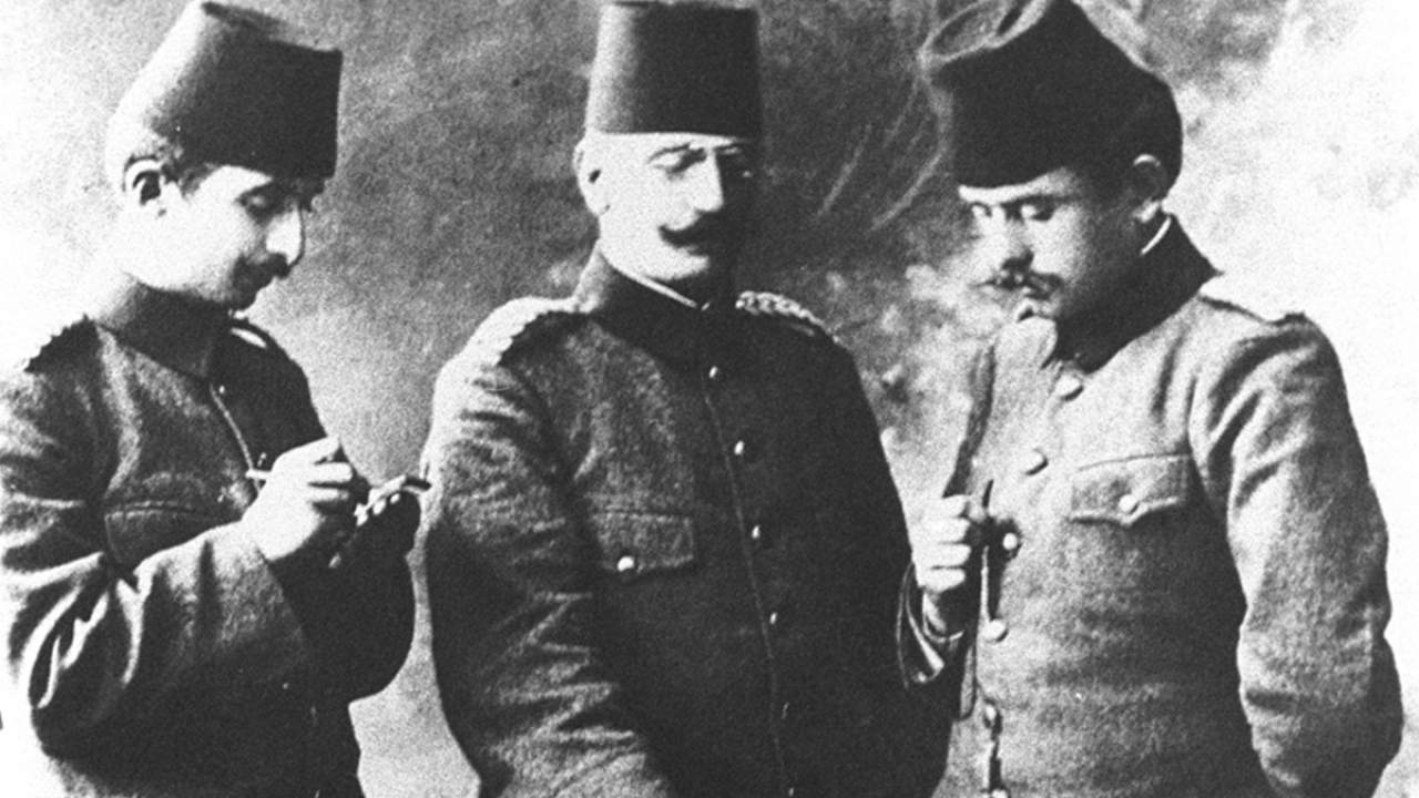 25 Nisan 1909`da 31 Mart ayaklanmasını bastırmak için harekete geçen Hareket Ordusu`na Edirne`den katılan 2. Süvari Tümeni`nin Komutanı Şevket Turgut Paşa (ortada), Kurmay Başkanı Kazım Karabekir (sağda) ve Kurmay Heyeti Üyesi ve Kolağası İsmet İnönü (solda) harita başında. (Arşiv)