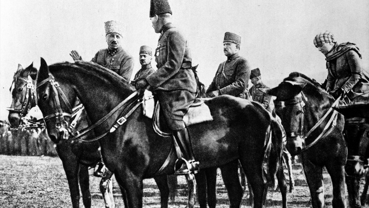 10 Şubat 1923`de Suvari Kolordusu Komutanı Fahrettin Altay (solda), çiftlik istasyonu civarında yapılan askeri tatbikatta Başkomutan Mustafa Kemal Atatürk`e (önde) bilgi veriyor. Tatbikata Kazım Karabekir Paşa (sağ 2) de bulundu. (Arşiv)