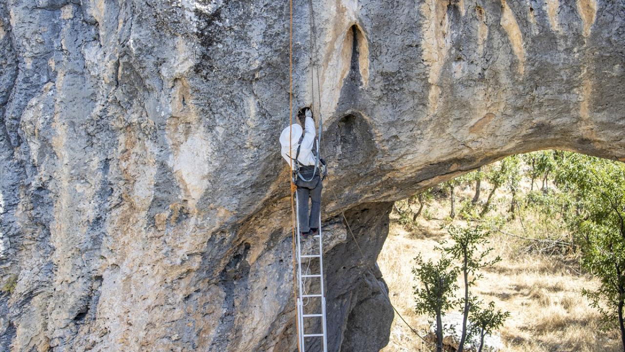 Alınan güvenlik önlemlerinin ardından metrelerce yüksekteki kayalıklarda bal dolu petekleri alıp, yerine boş olanları koyan grup, hazırladıkları çamurla yeniden yuvayı onarıyor.