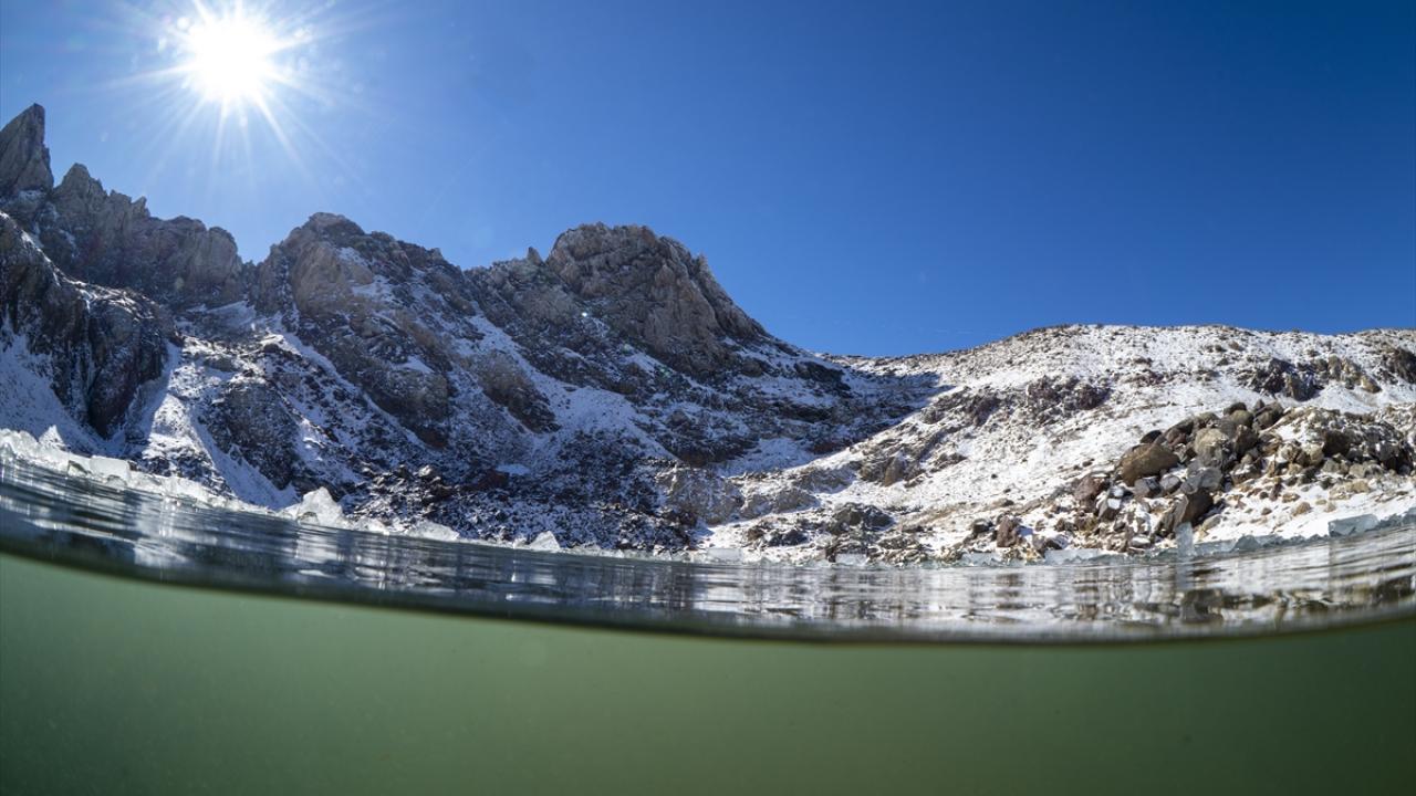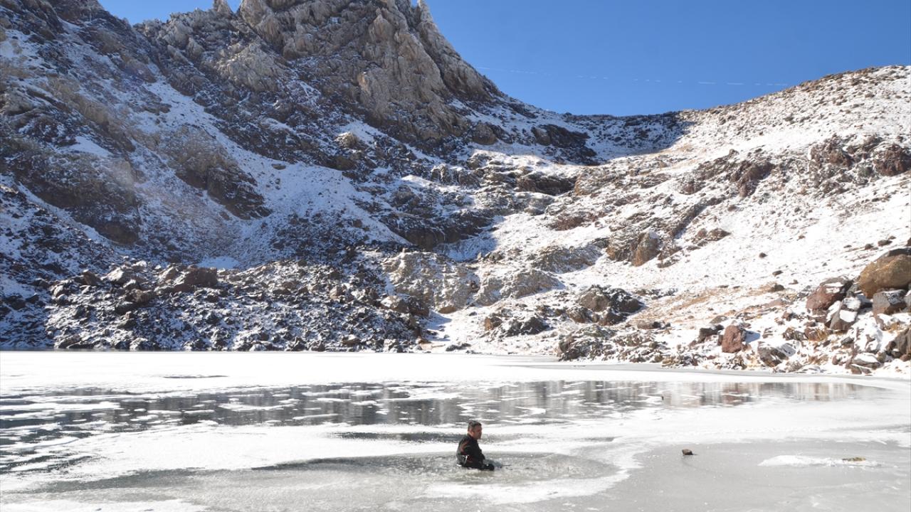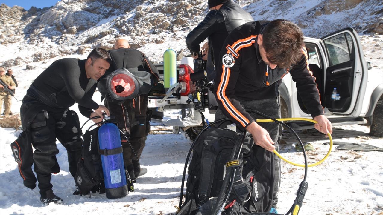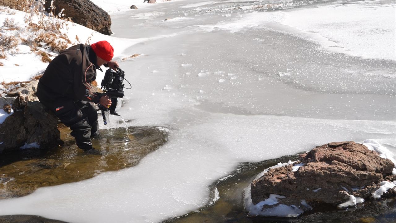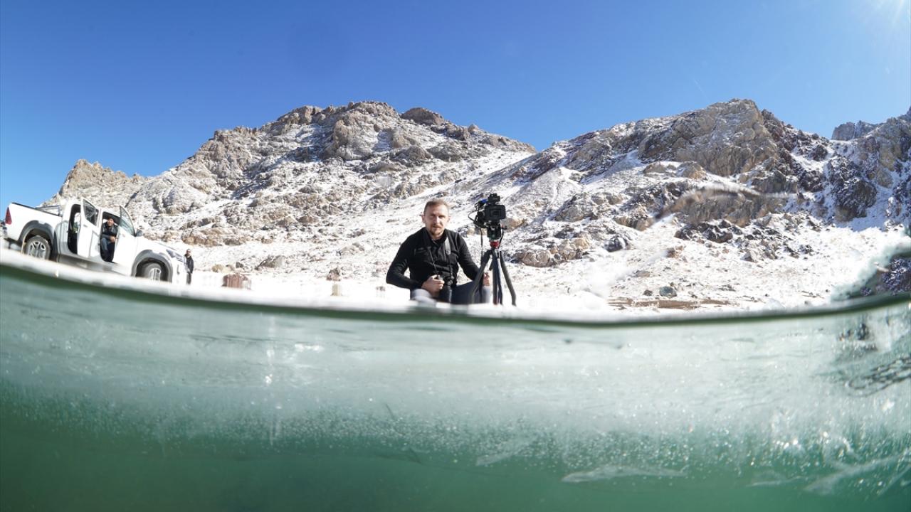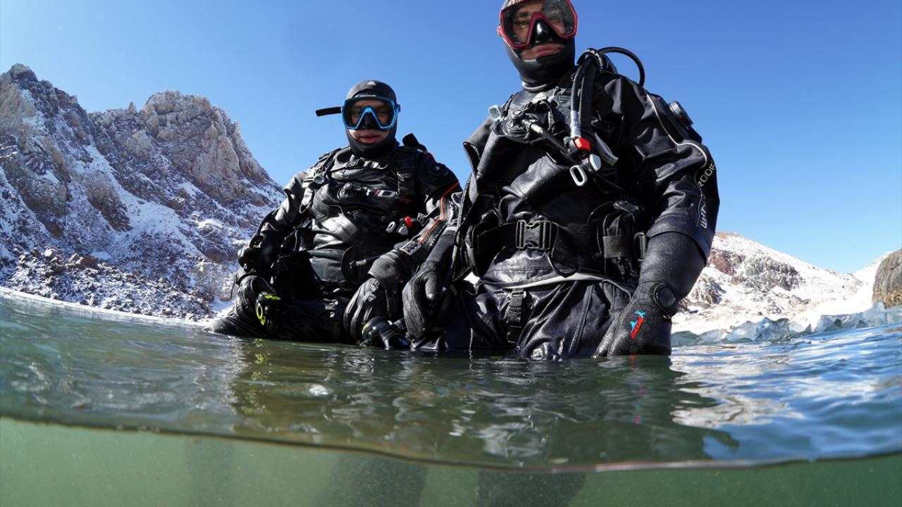 Büyük bölümü karla kaplı bölgede soğuk havanın etkisiyle yüzeyi donan gölde, buzu kırarak dalabilecekleri alan açan Ceylan, Çelikel ve Ök, daha sonra gerçekleştirdikleri dalışla gölün altını görüntüledi.
