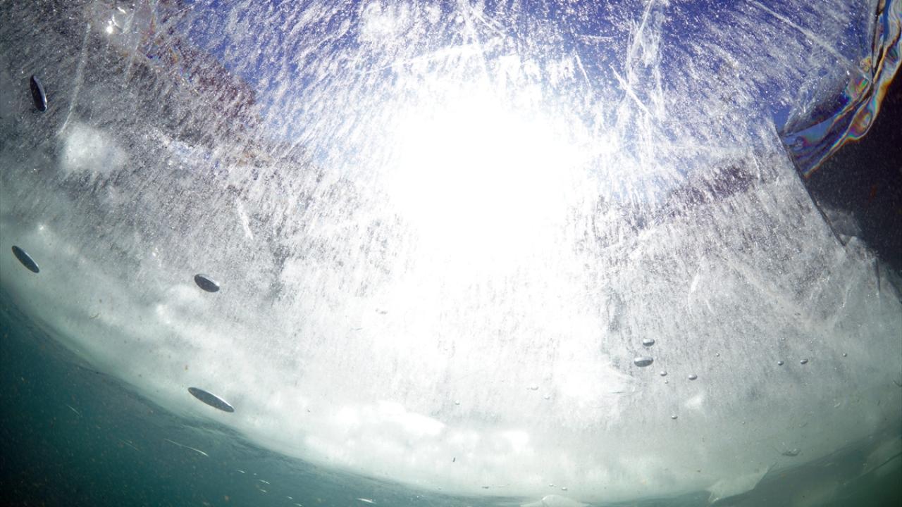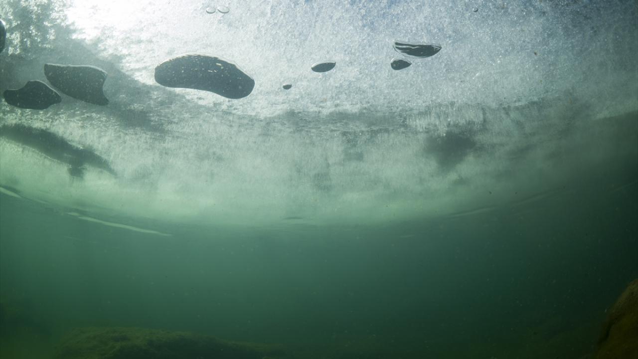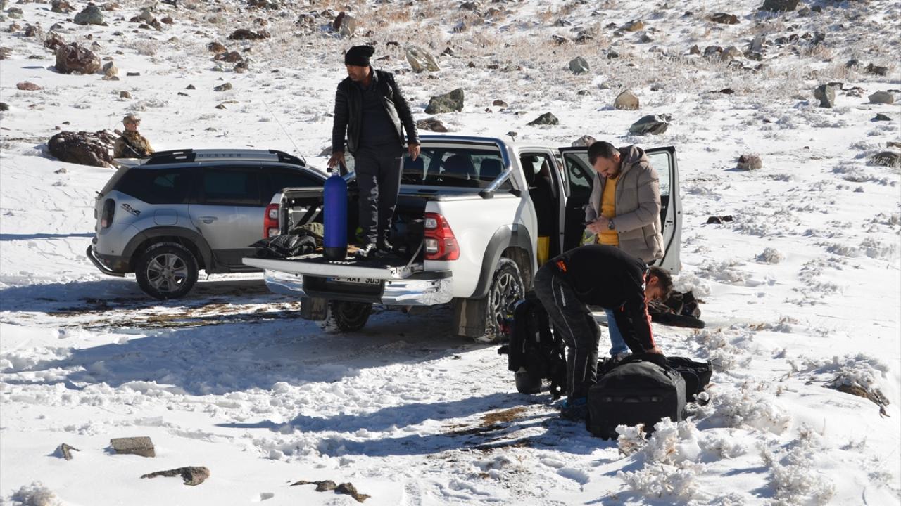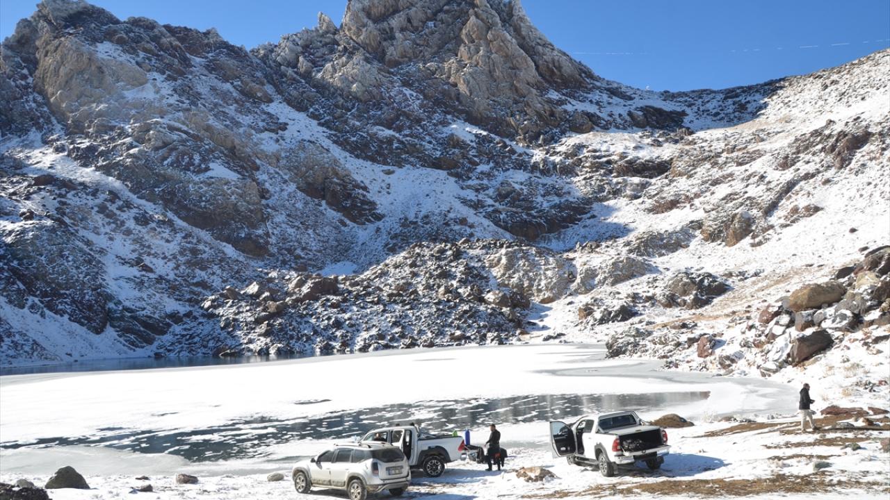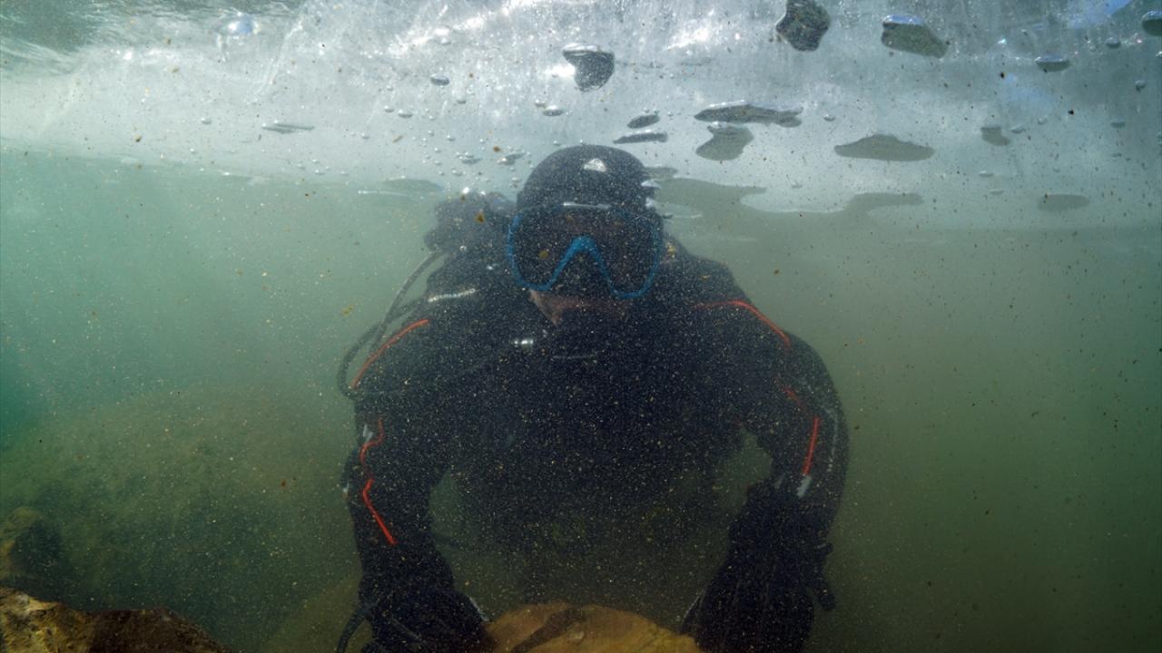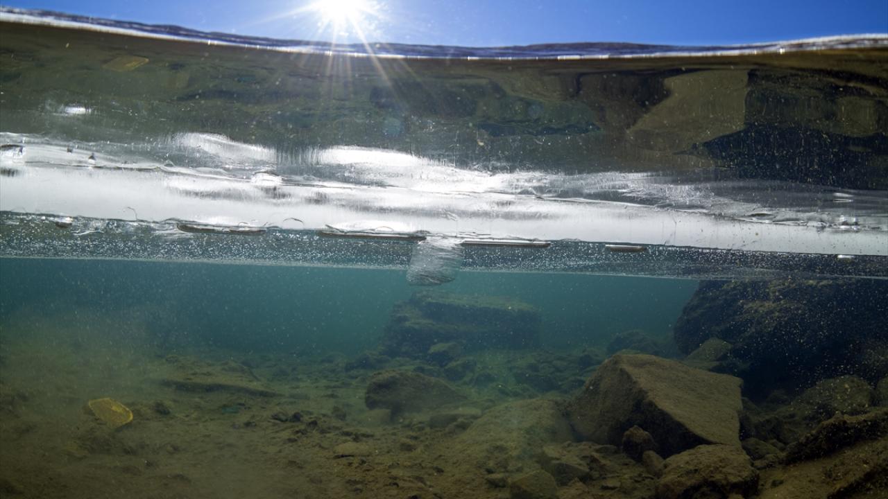 Büyük bölümü karla kaplı bölgede soğuk havanın etkisiyle yüzeyi donan gölde, buzu kırarak dalabilecekleri alan açan Ceylan, Çelikel ve Ök, daha sonra gerçekleştirdikleri dalışla gölün altını görüntüledi.