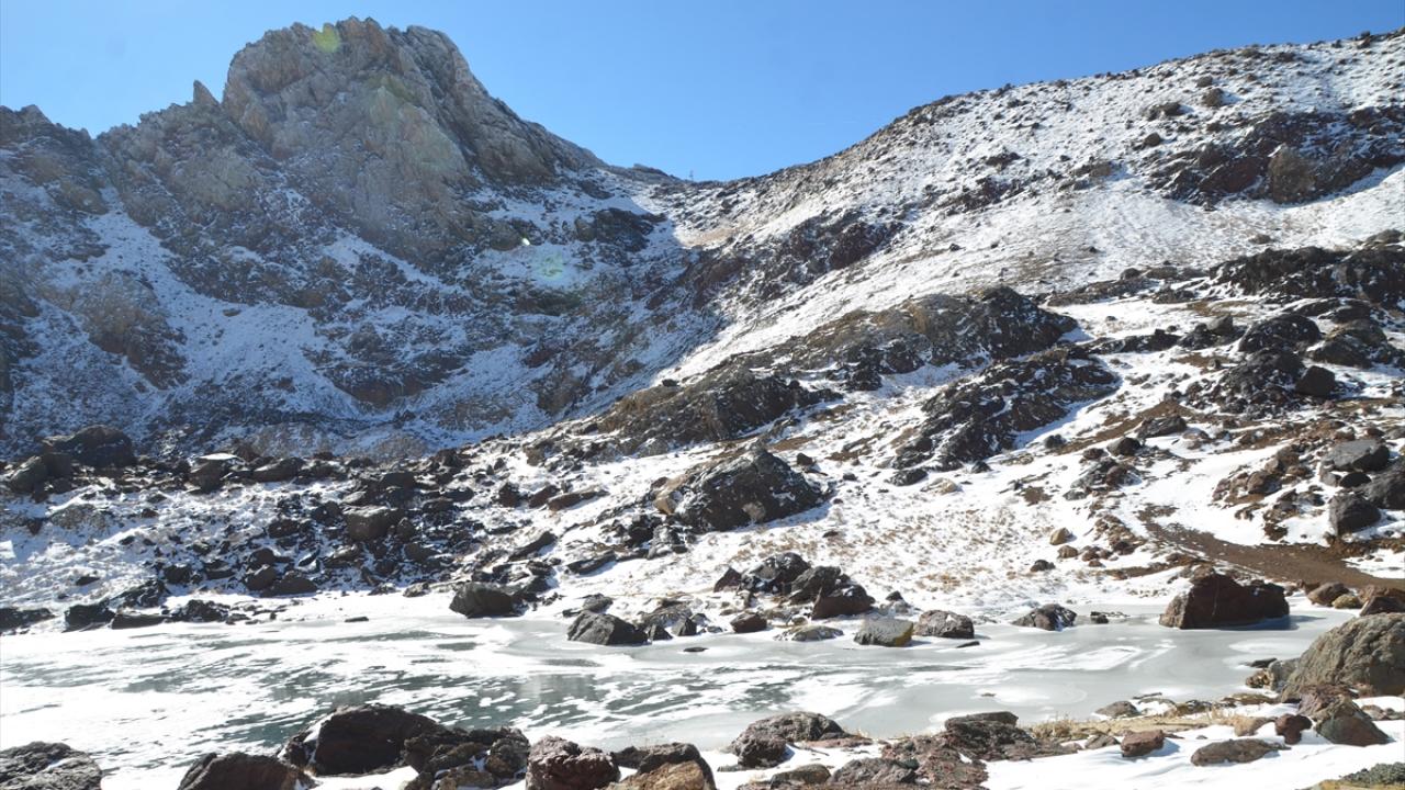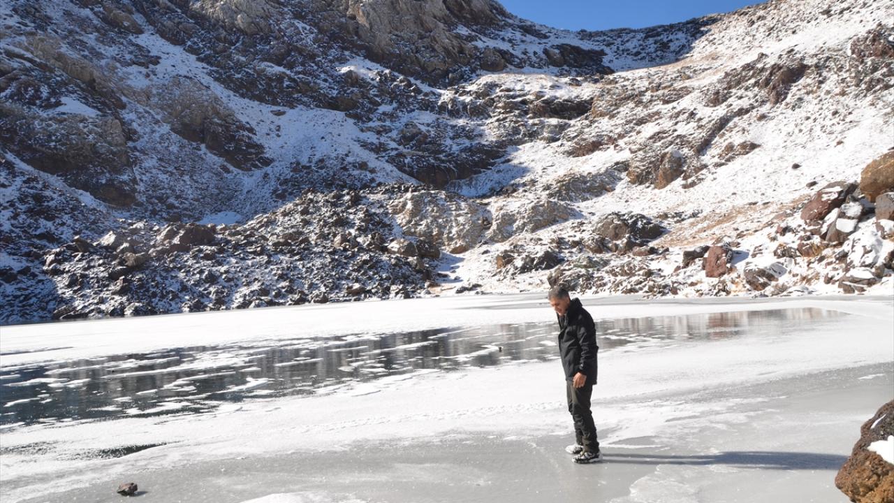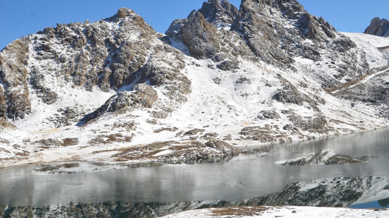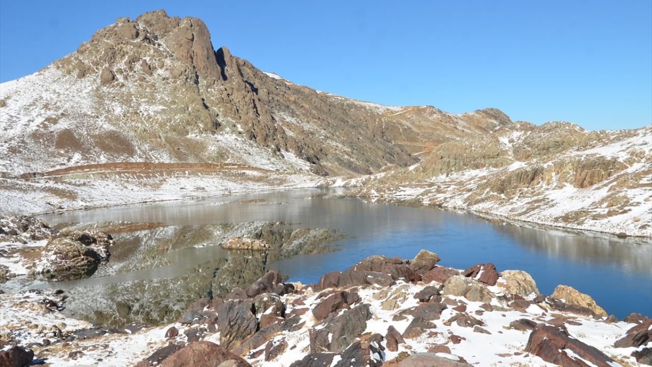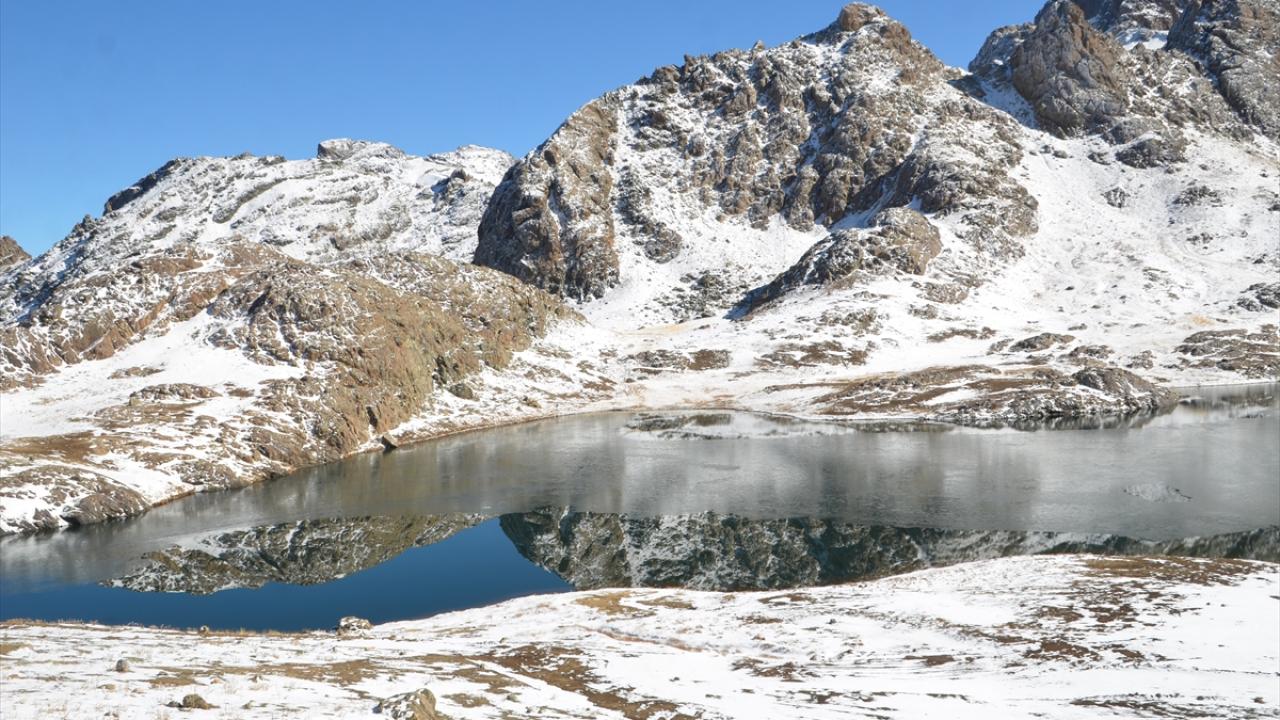 Yağışın ardından beyaza bürünen Cilo Dağları`ndaki Sat Buzul Gölleri`nin yüzeyinin bir bölümü, soğuk hava nedeniyle buzla kaplandı.