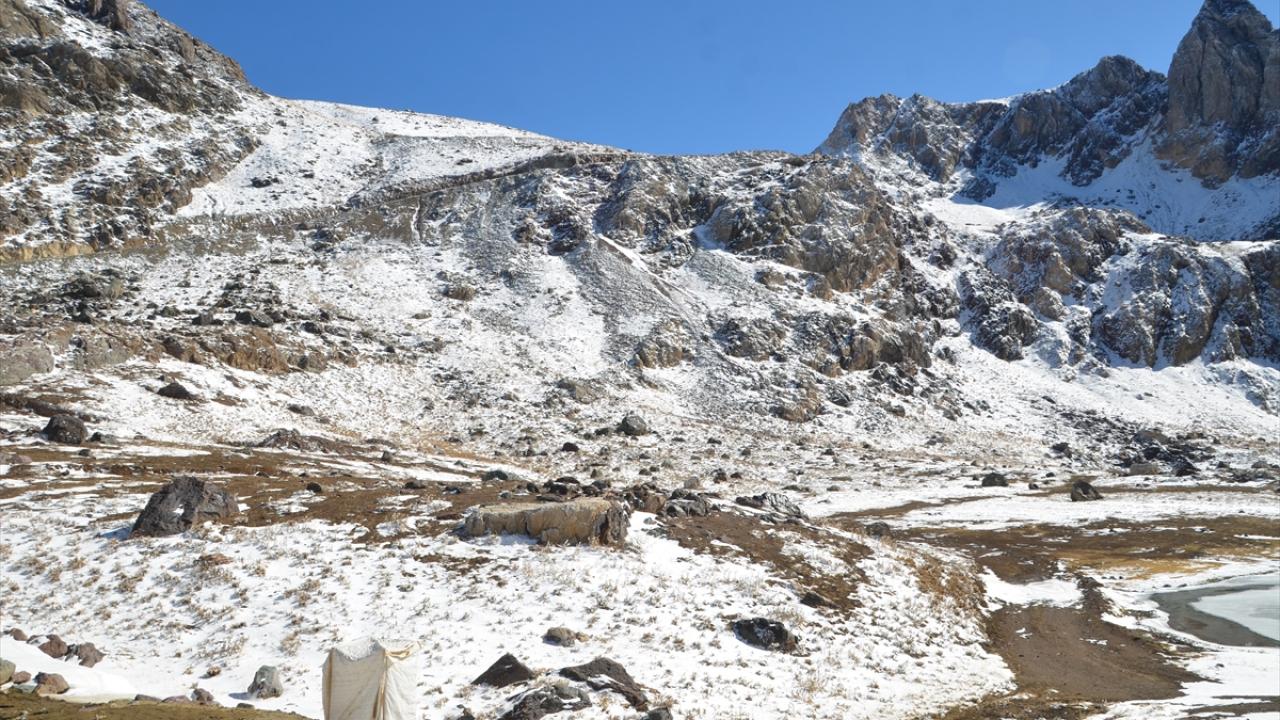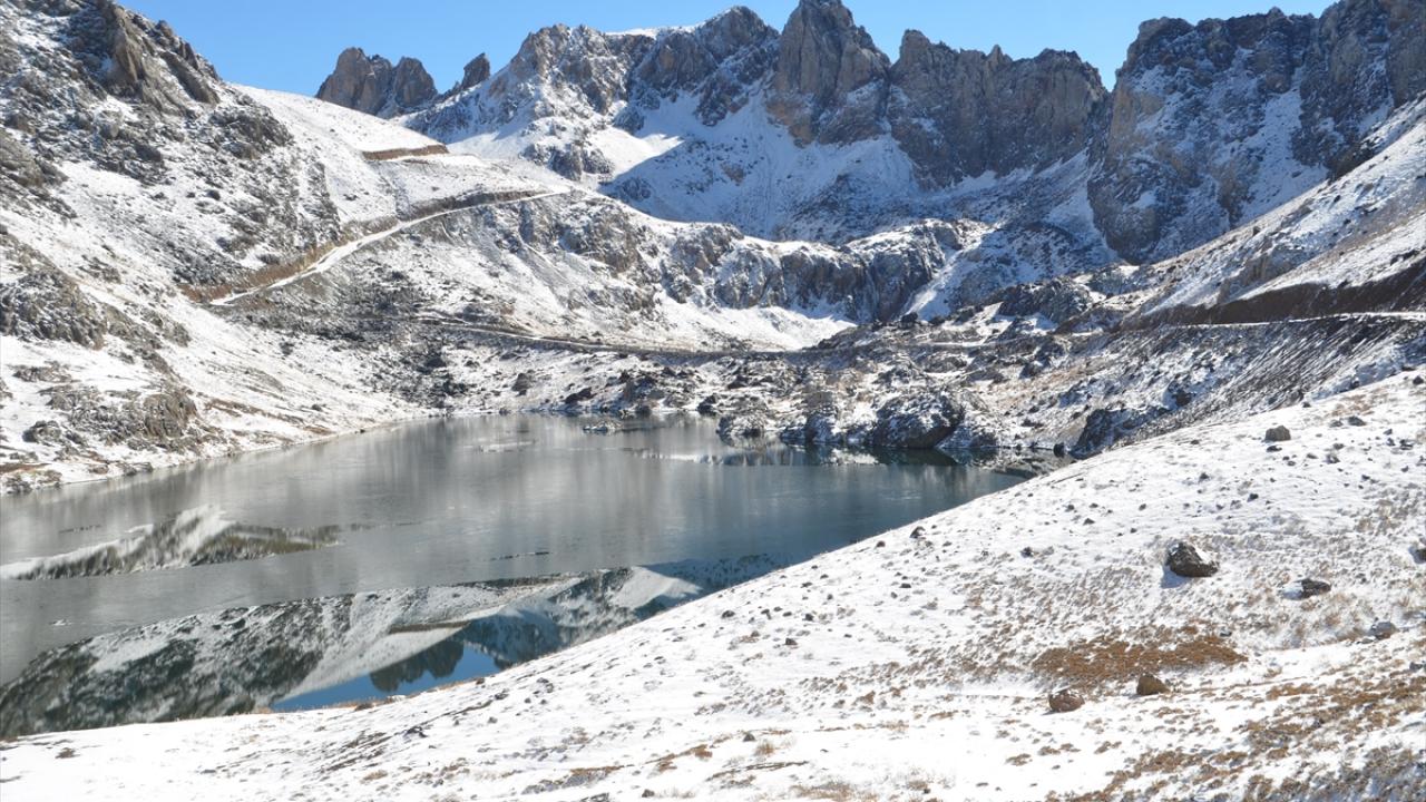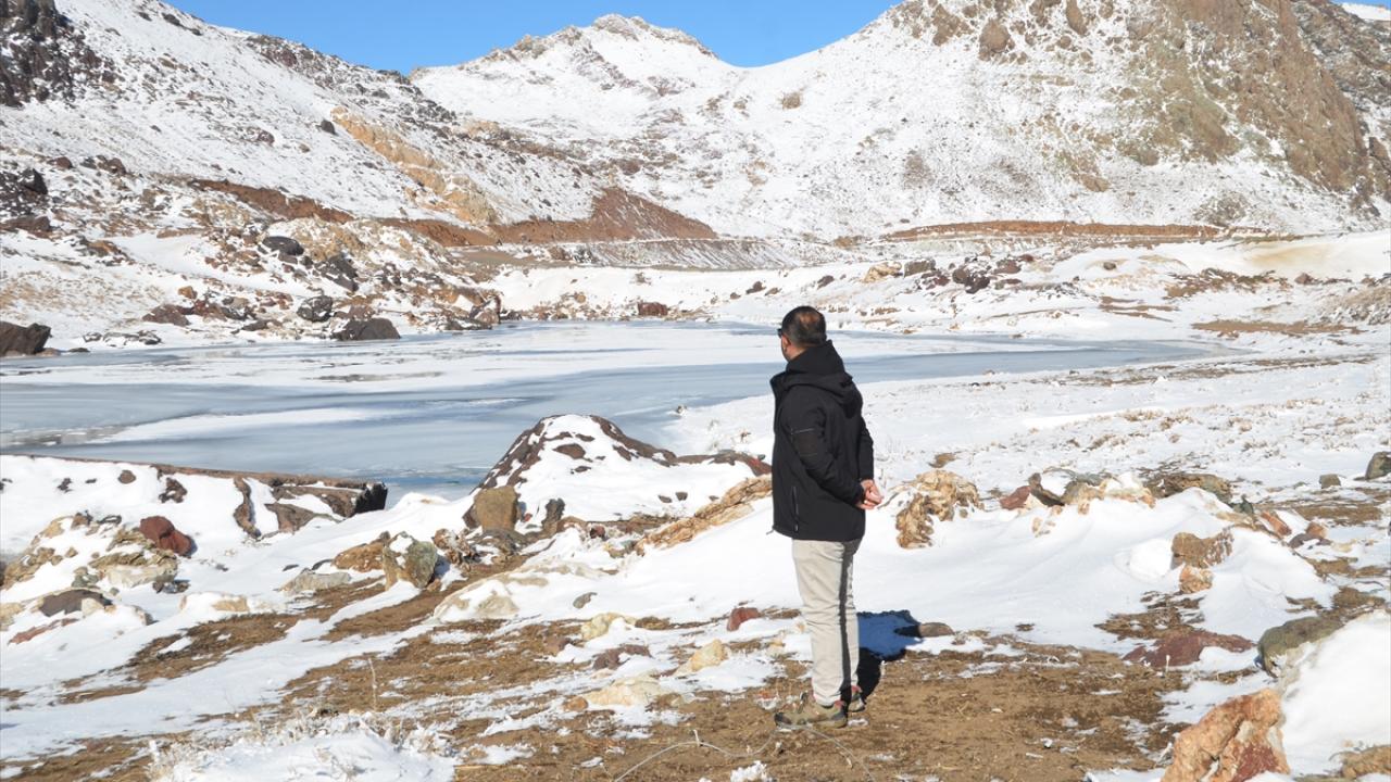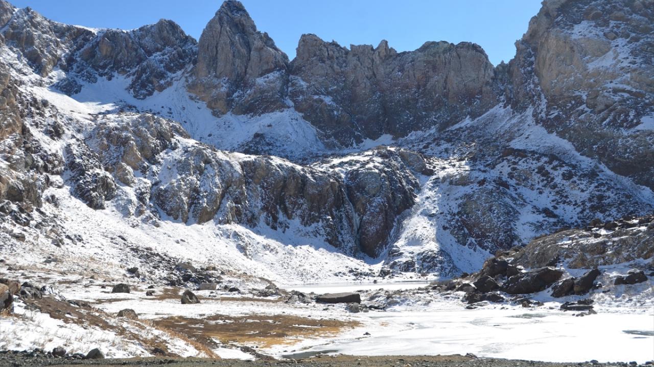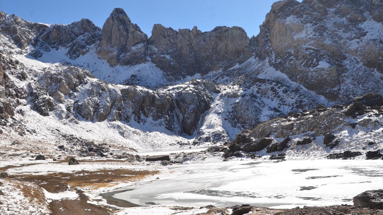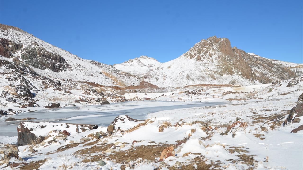 Yağışın ardından beyaza bürünen Cilo Dağları`ndaki Sat Buzul Gölleri`nin yüzeyinin bir bölümü, soğuk hava nedeniyle buzla kaplandı.