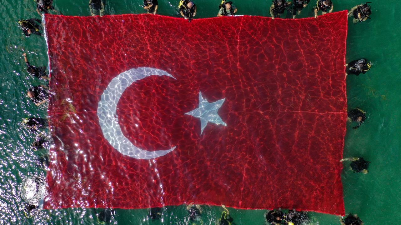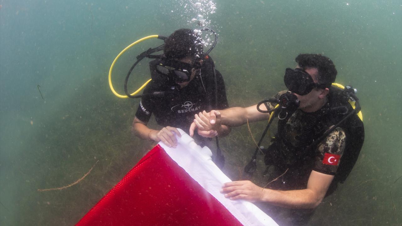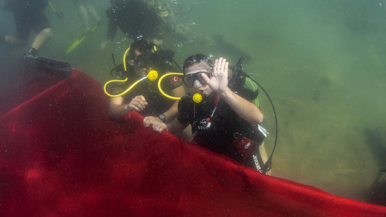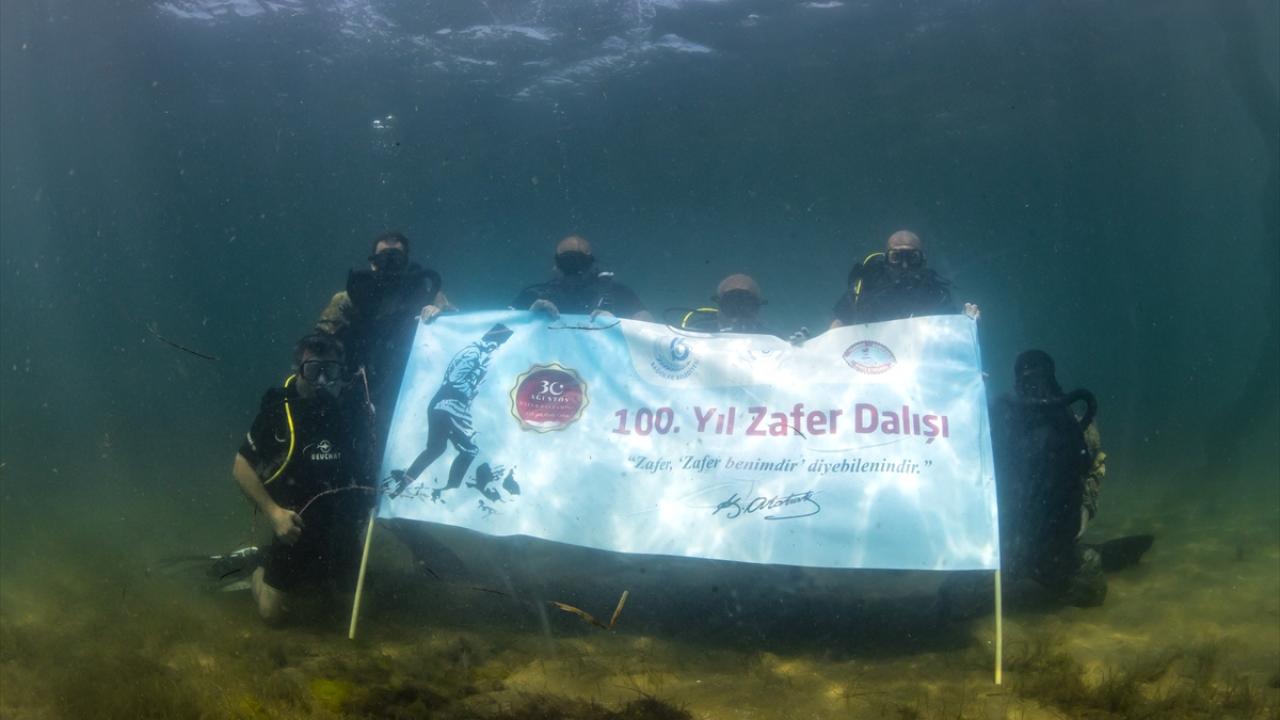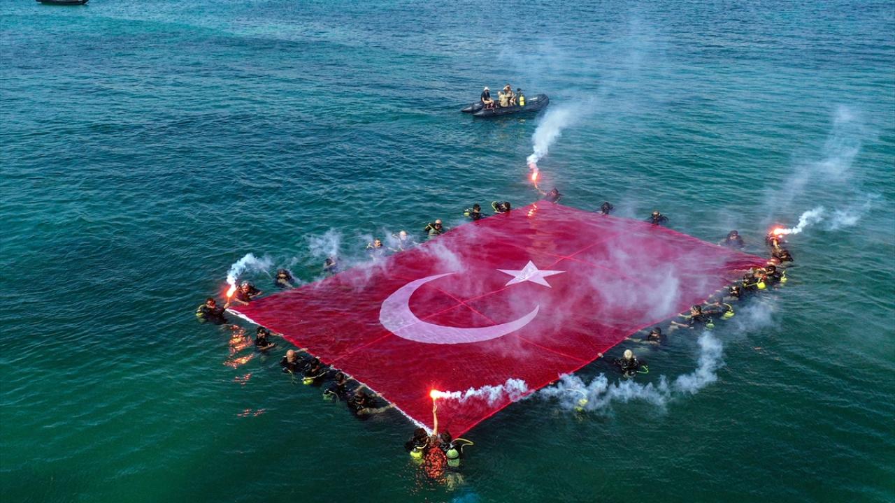 Dalgıçlar, 100. yıl dönümü anısına 100 metrekare büyüklüğündeki Türk bayrağını su altında açarak fotoğraf çektirdi.