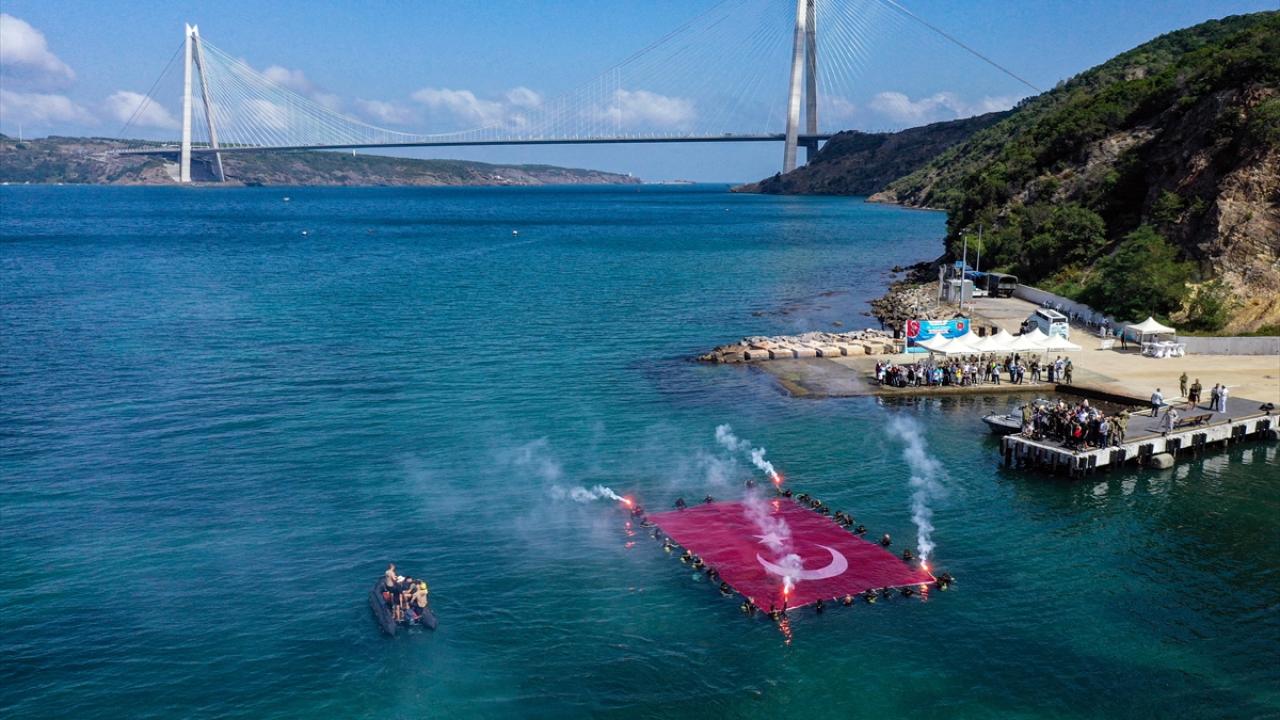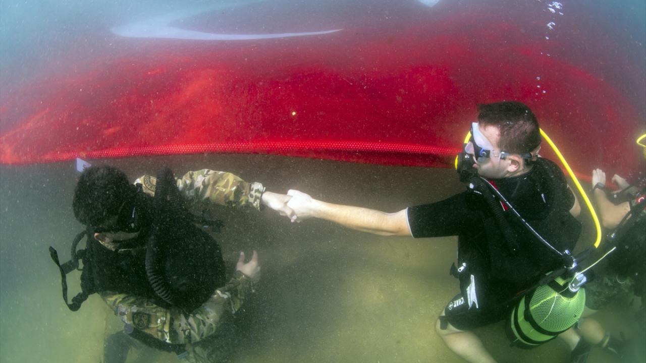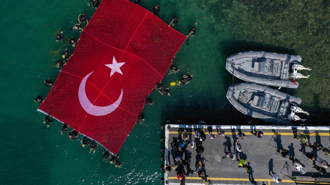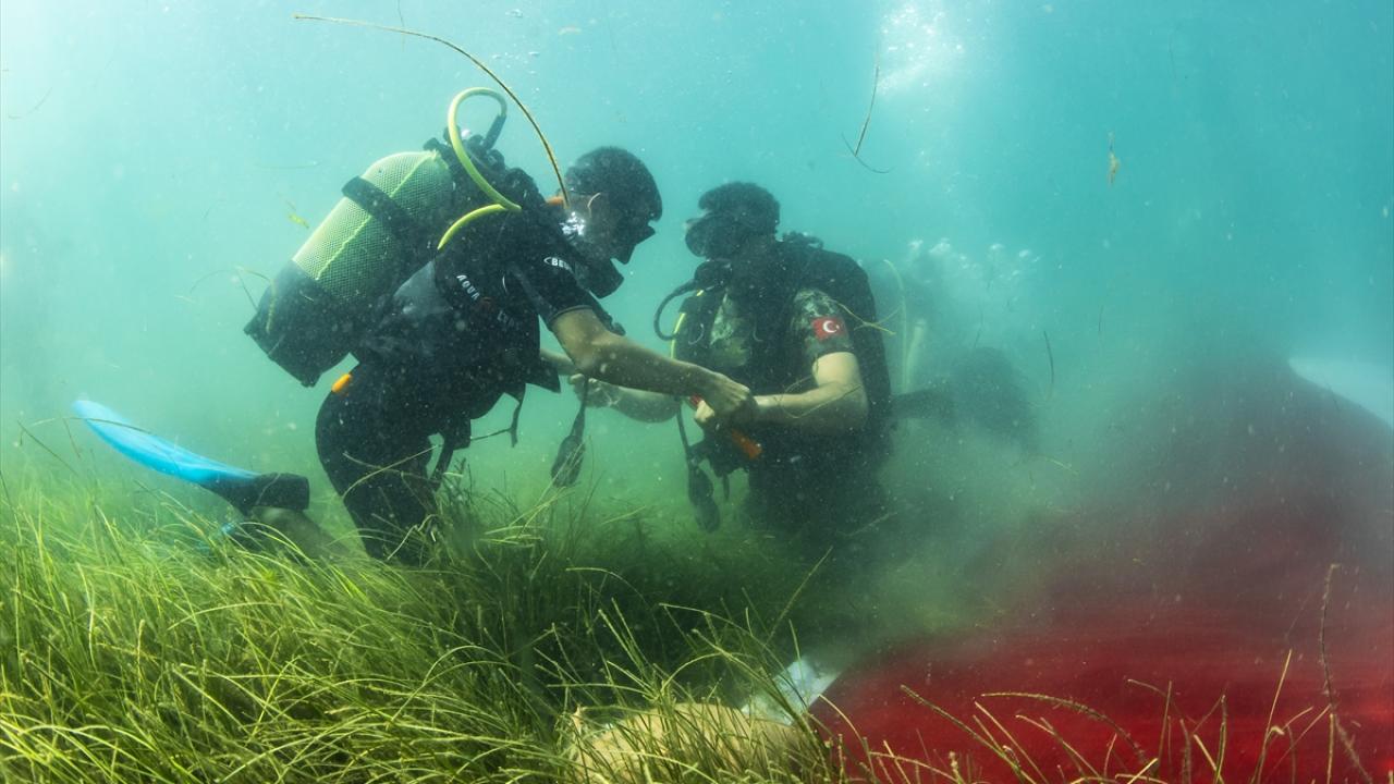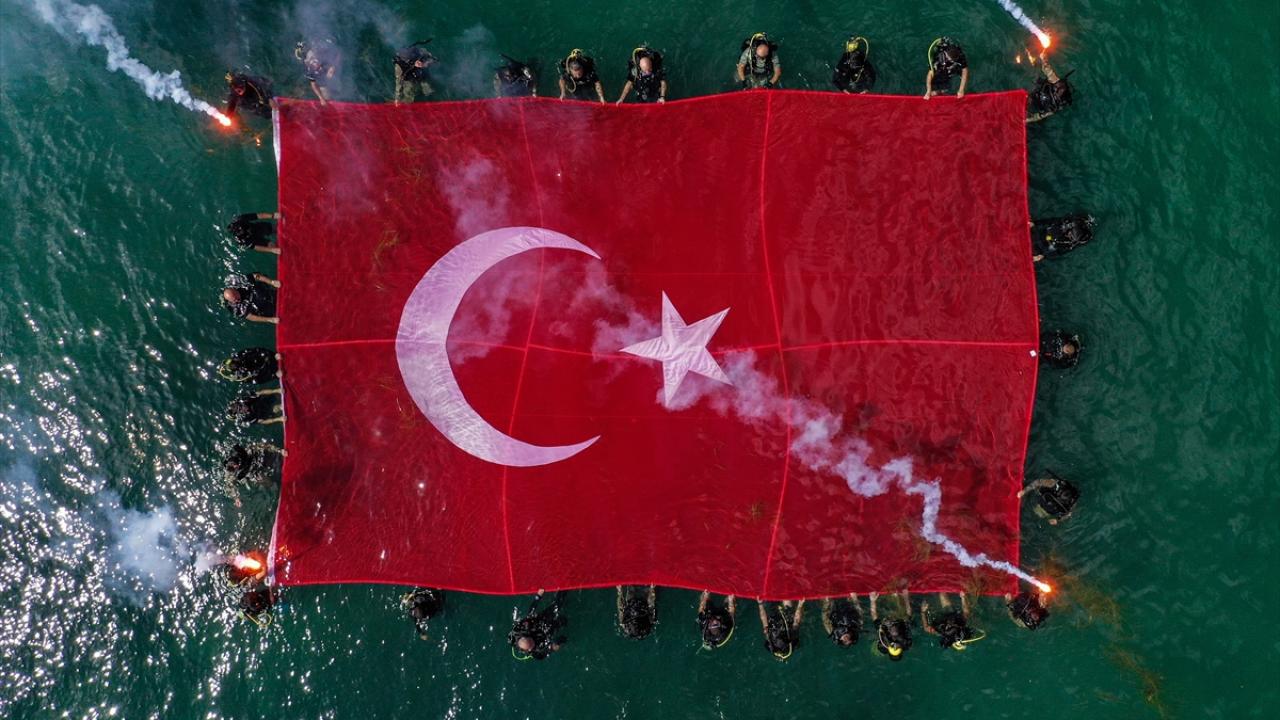Dalgıçlar, 100. yıl dönümü anısına 100 metrekare büyüklüğündeki Türk bayrağını su altında açarak fotoğraf çektirdi.