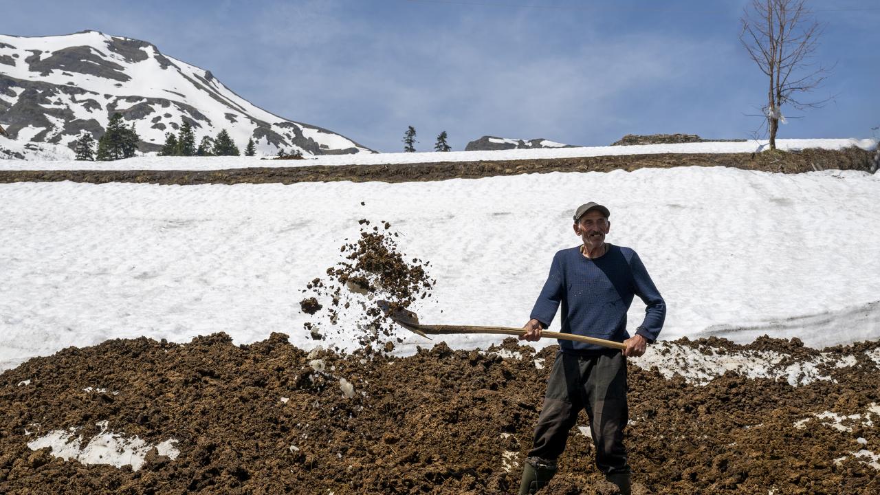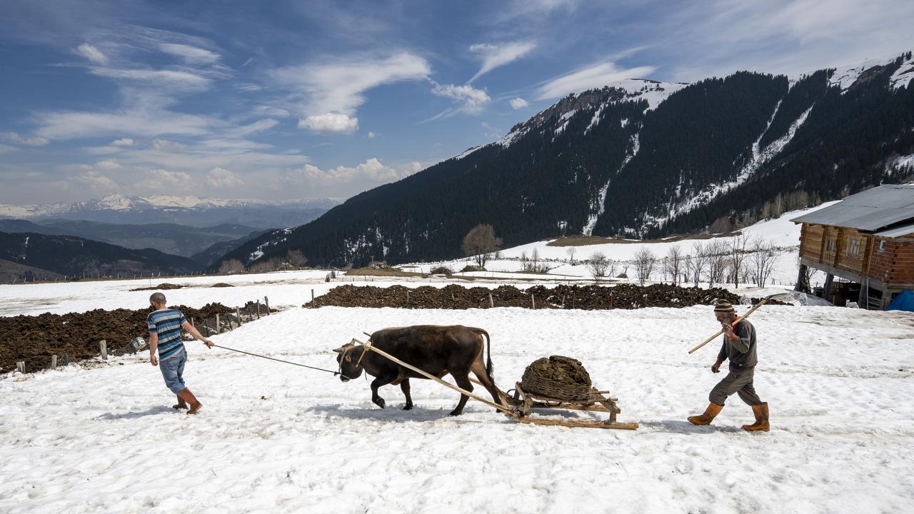 Çiftçilik yaparak geçimlerini sağladıklarını ifade eden Kaya, "Kar yağışıyla tarlalar karla kaplandı, patates tarlalarına açtığımız kanallarla gübre döküyoruz. Organik gübreyle ürün yetiştiriyoruz, hayvan gübresiyle ürünlerimiz çok güzel oluyor. Kışın buralarda yaşam zordur, hayvanlarla uğraşıyoruz." dedi.
