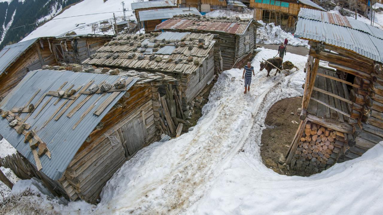 Artvin'in Şavşat ilçesine bağlı Karçal Dağları yamaçlarında bulunan karla kaplı Maden köyünün sakinleri, umutla baharın gelmesini bekliyor.