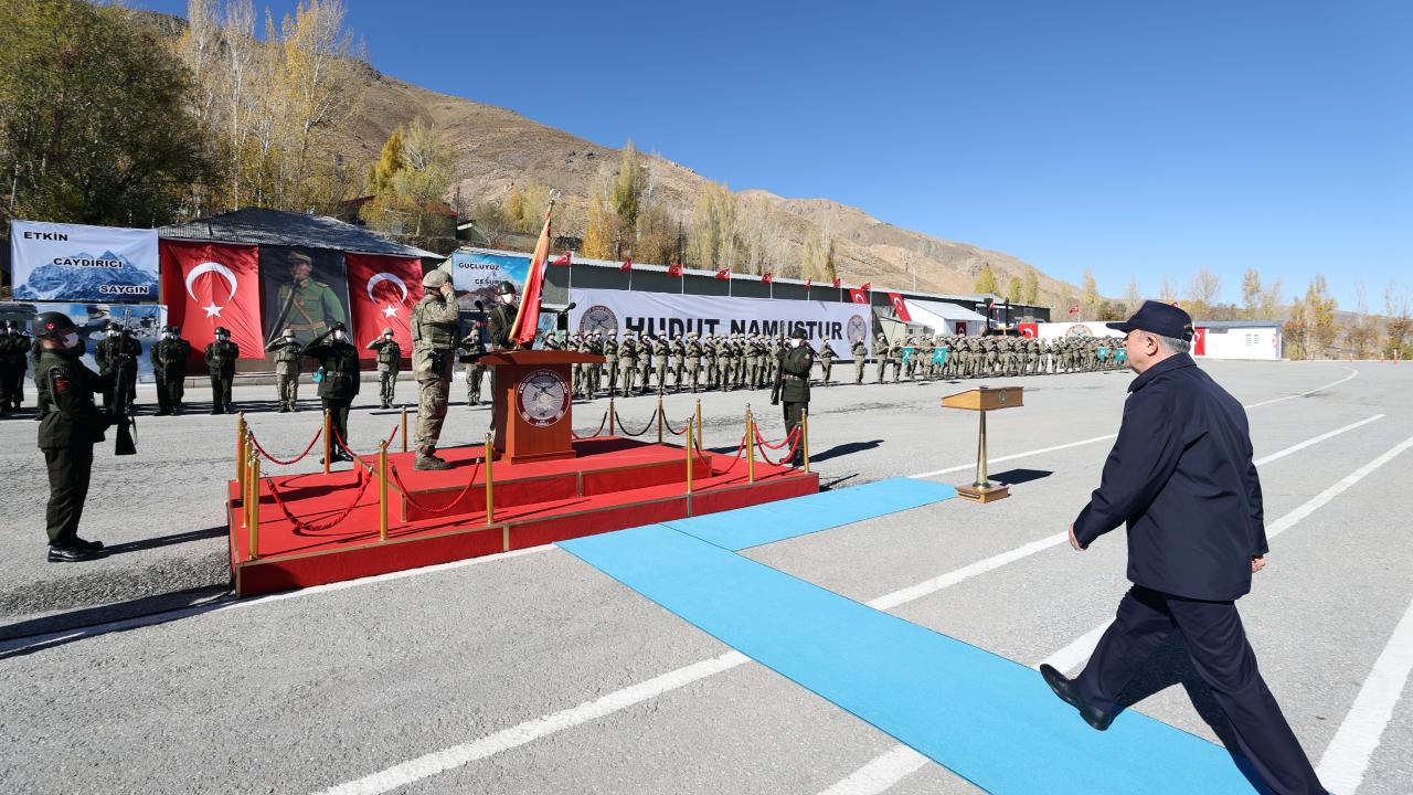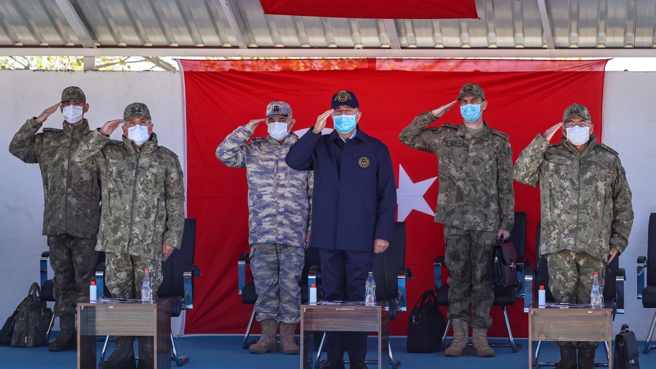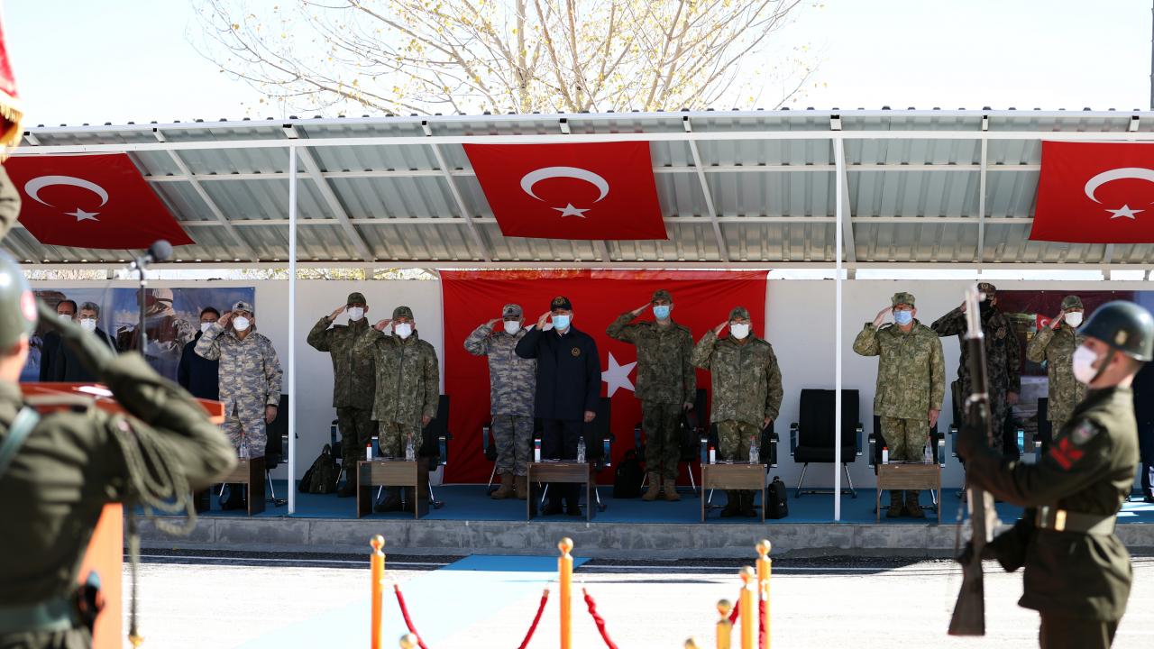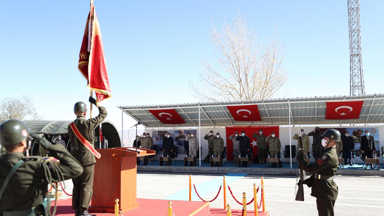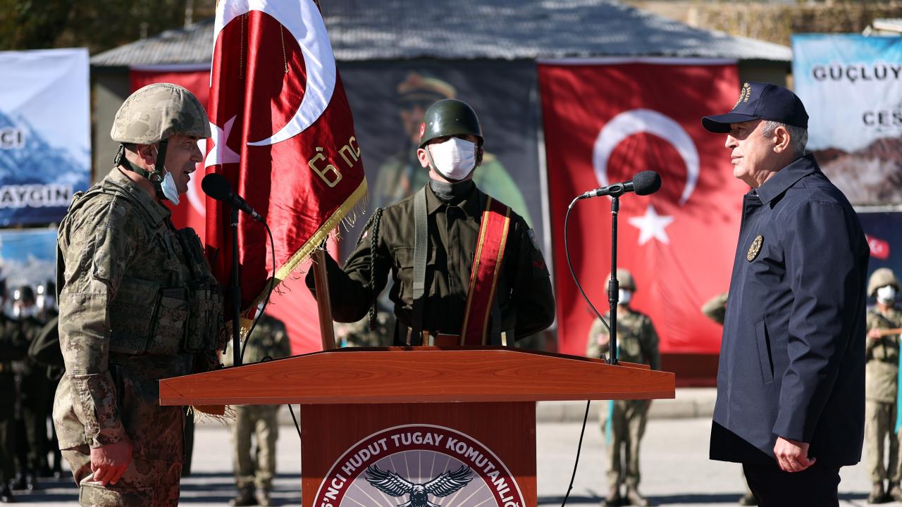 Milli Savunma Bakanı Akar`ın sancağı, 6. Hudut Tugay Komutanı Tuğgeneral İlker Ertuğrul`a tesliminin ardından Cumhurbaşkanı Erdoğan, telefondan Mehmetçiğe hitap etti.