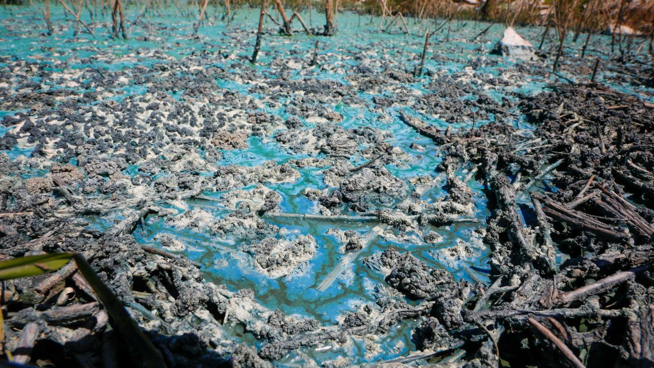 Suyun üzerine ayrı bir katman oluşturan tabakanın göl kenarındaki otlara ve taşlara da bulaştığı da görüldü.