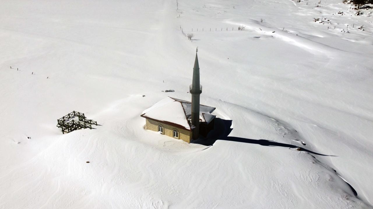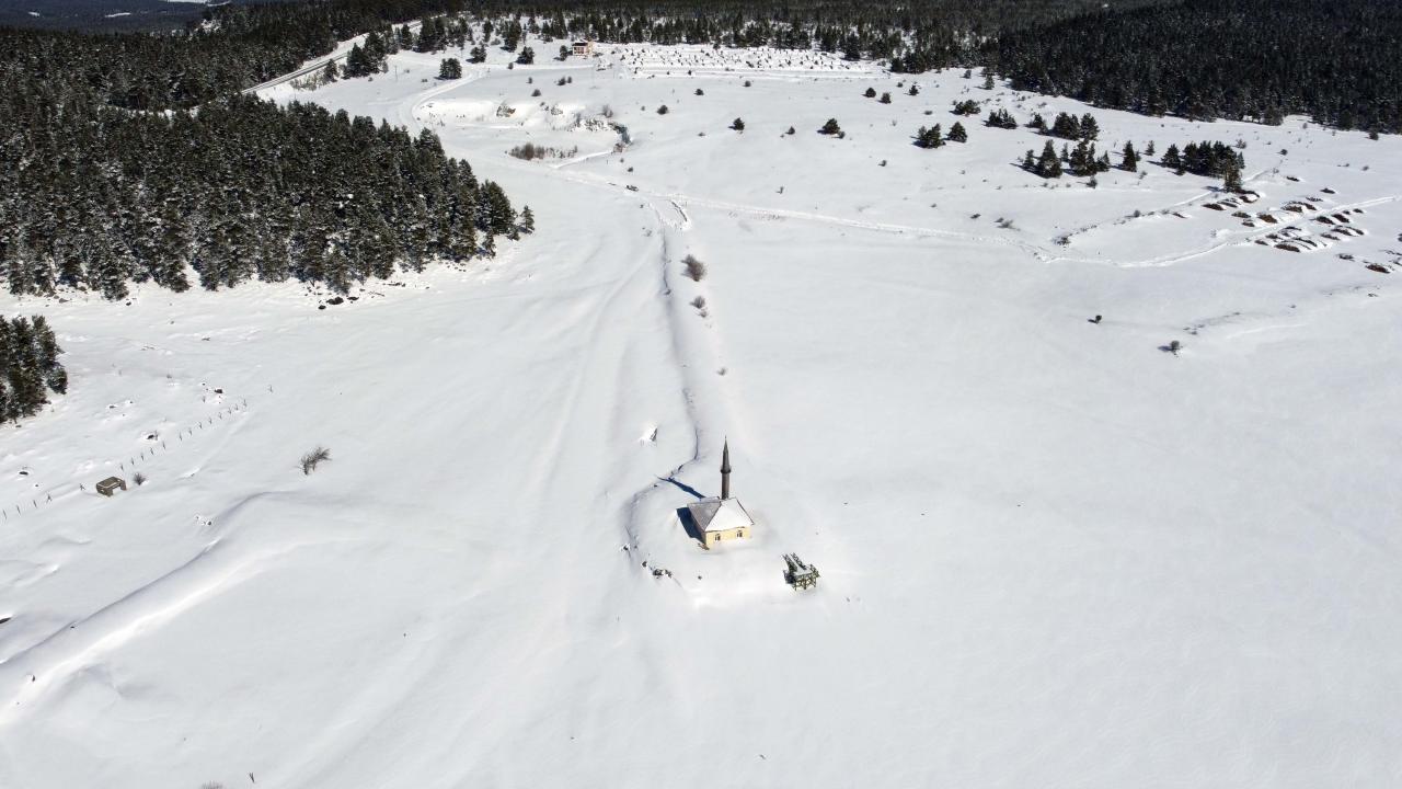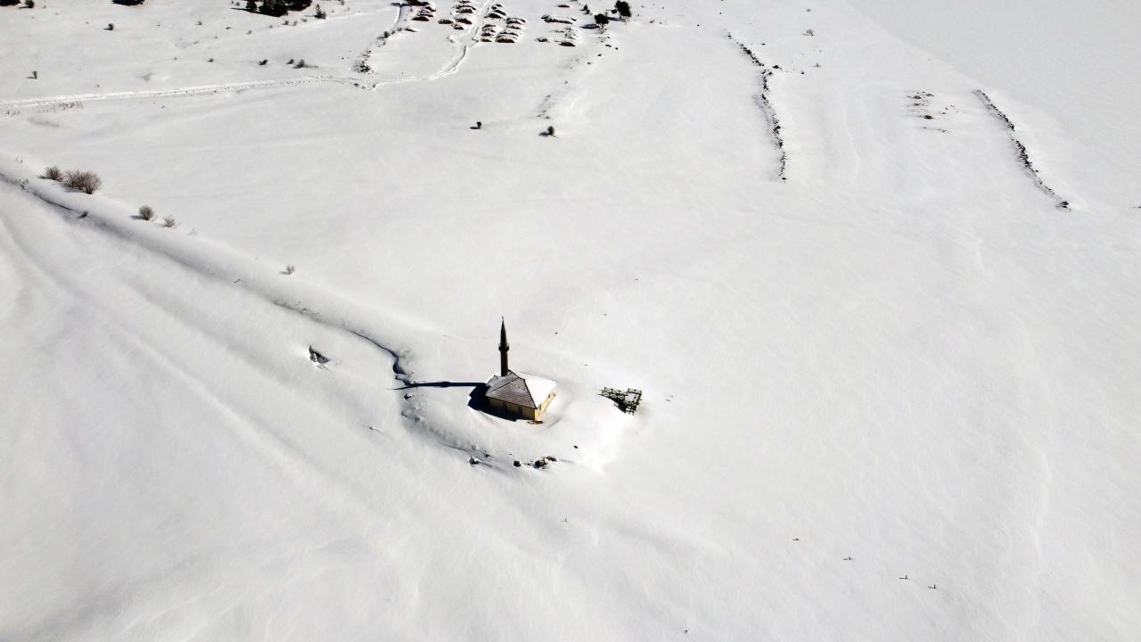 Karlarla kaplı bölgede kalan caminin sunduğu manzara dronla görüntülendi.