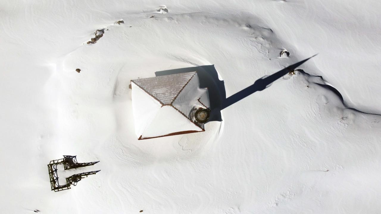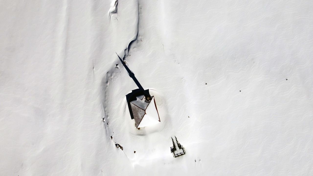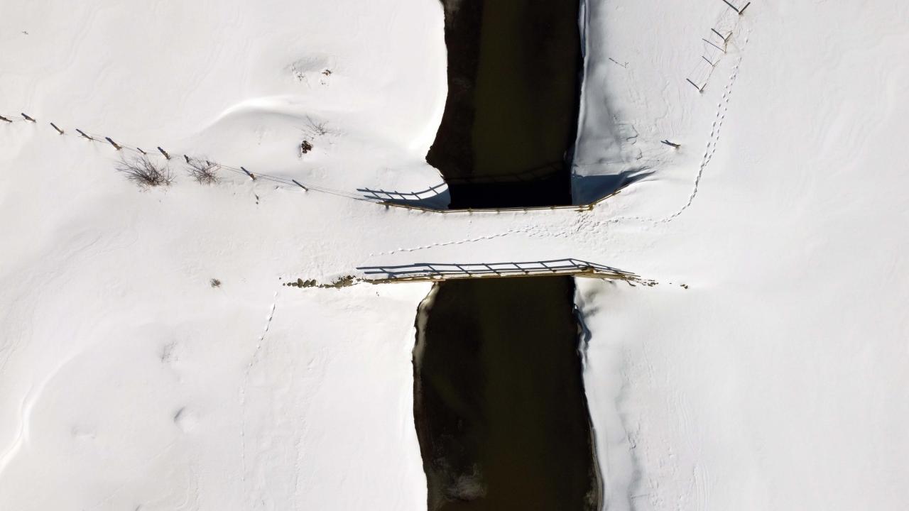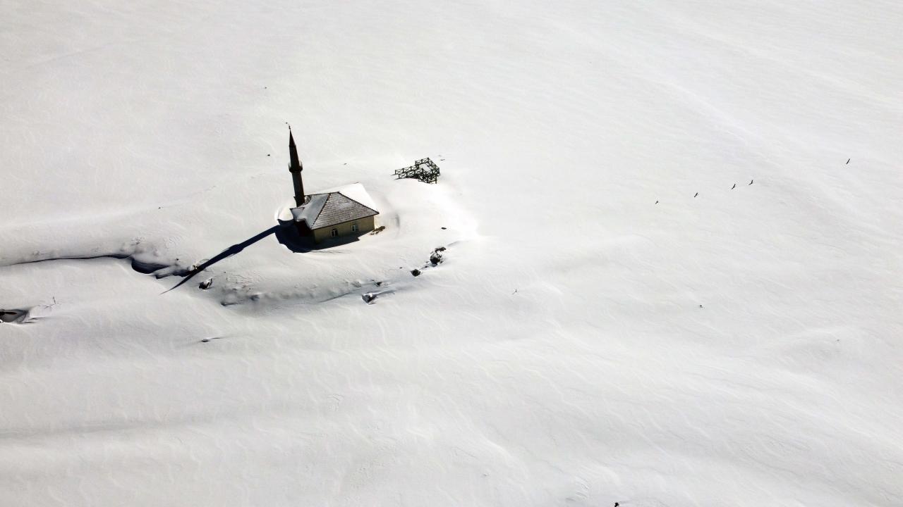 Karlarla kaplı bölgede kalan caminin sunduğu manzara dronla görüntülendi.