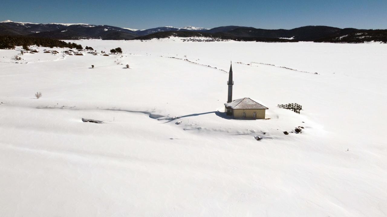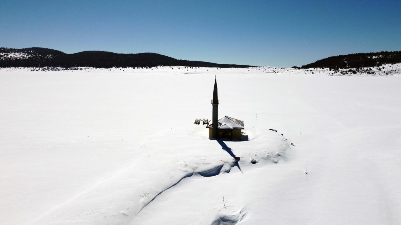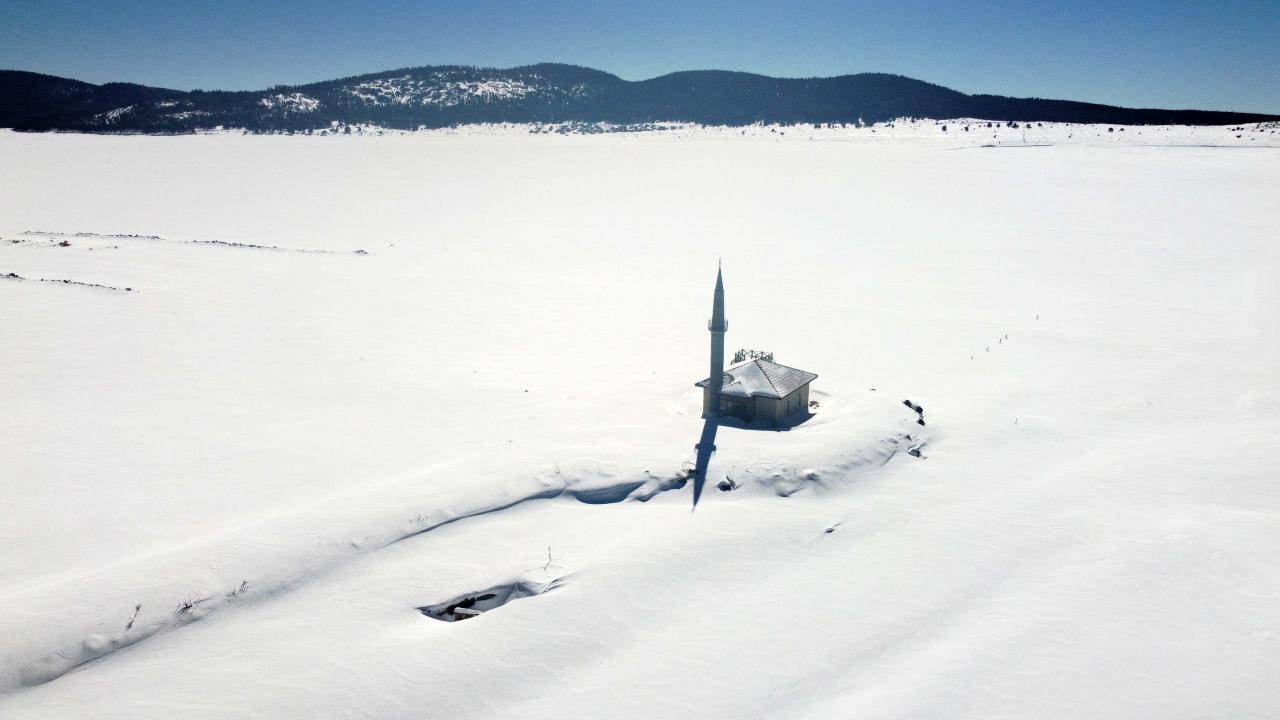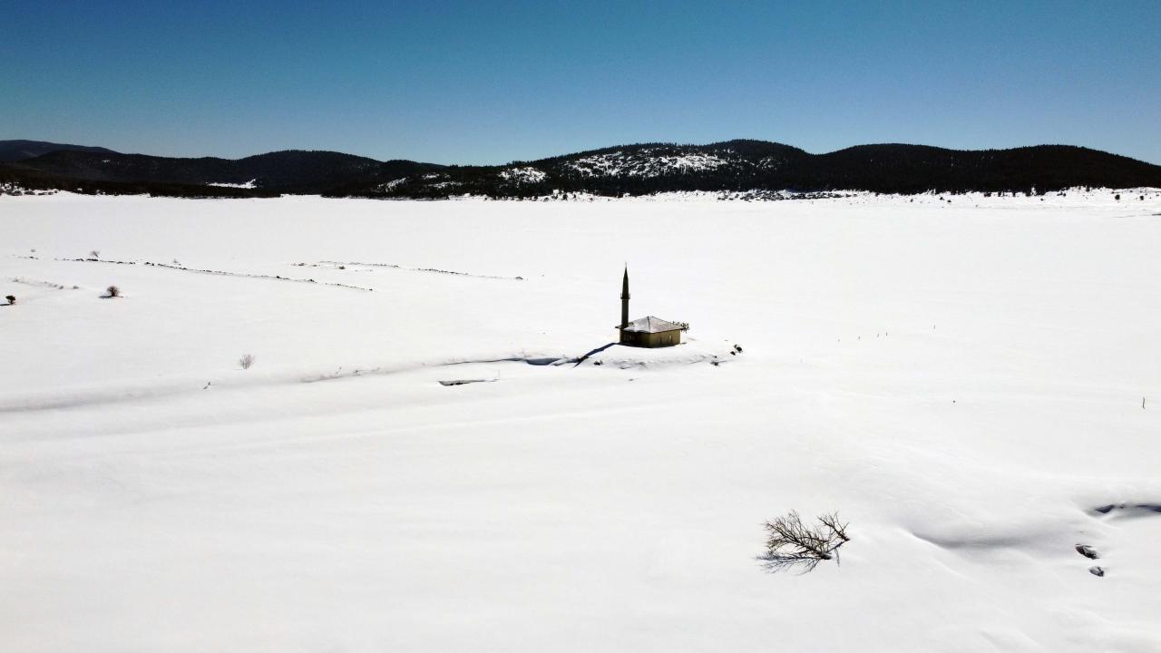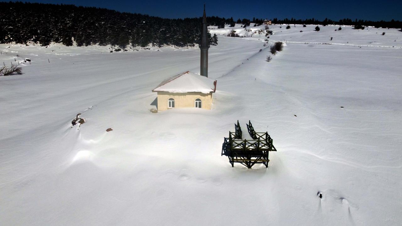 Bölgede etkili olan kar yağışı sonrasında göl havzası tamamen karlarla kaplanırken cami de adeta "kar denizi" içinde kaldı.