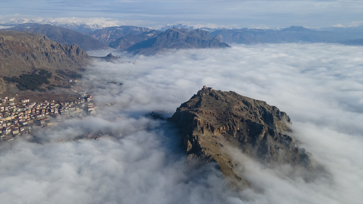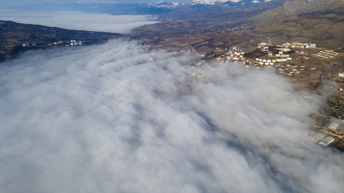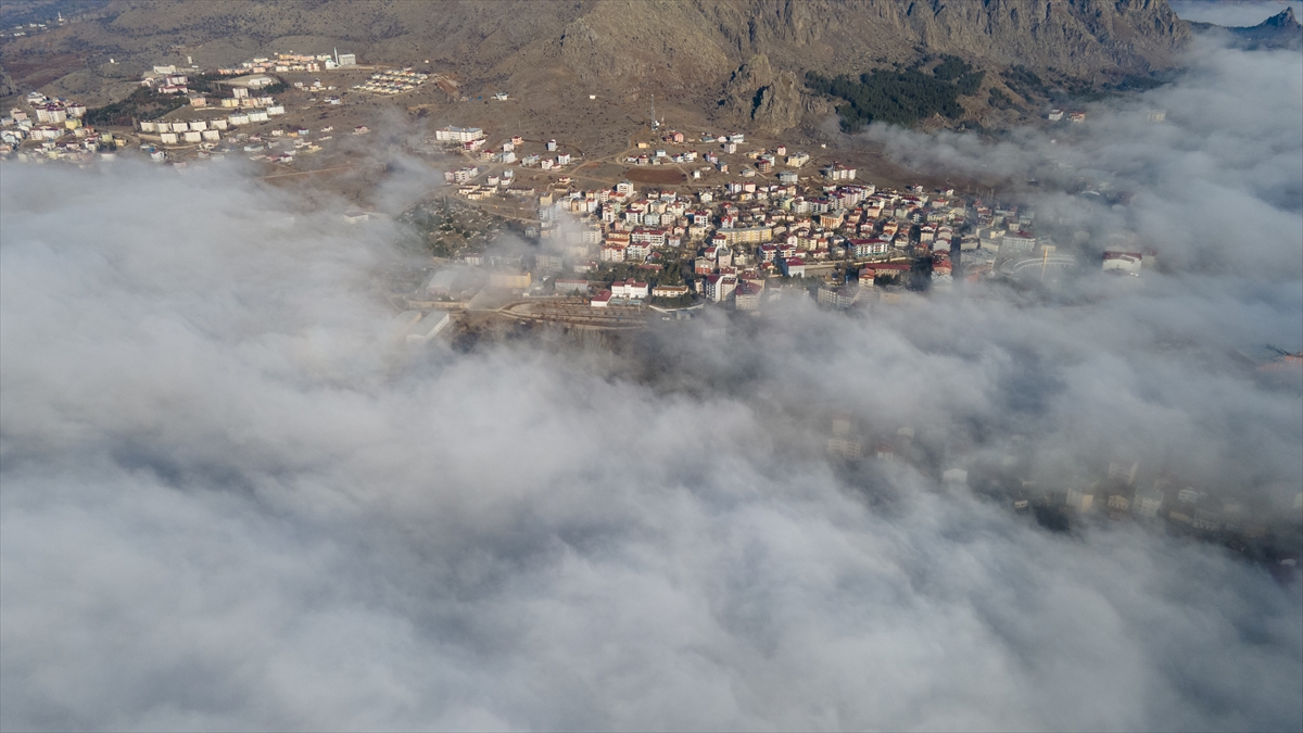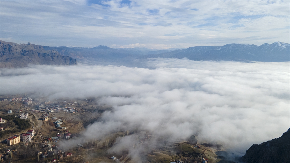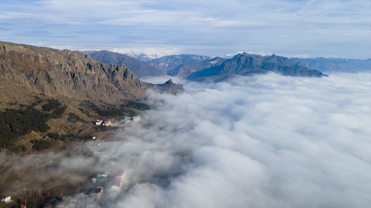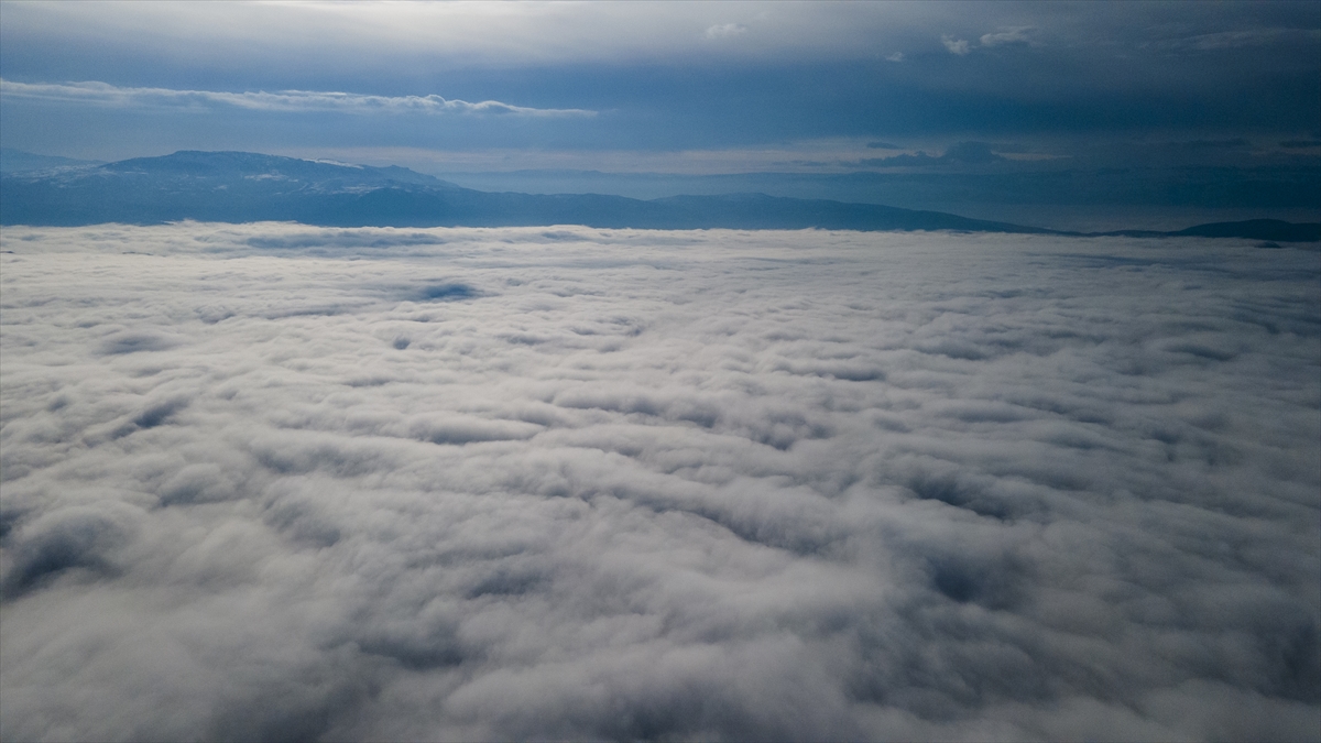 Yerleşim yerleri ve dağların bir bölümünü kaplayan sis, dronla görüntülendi.