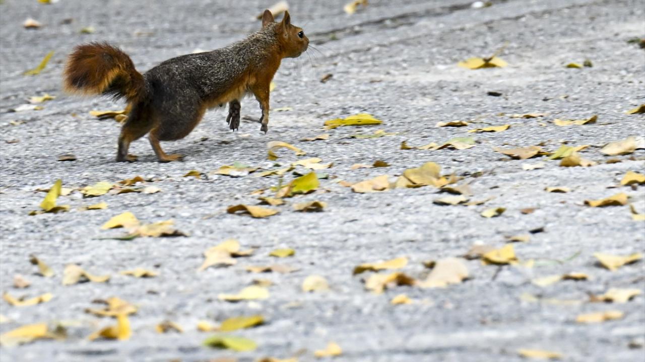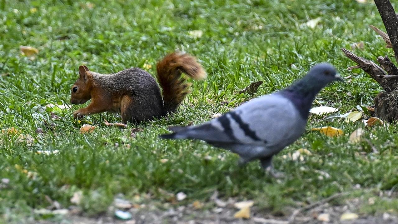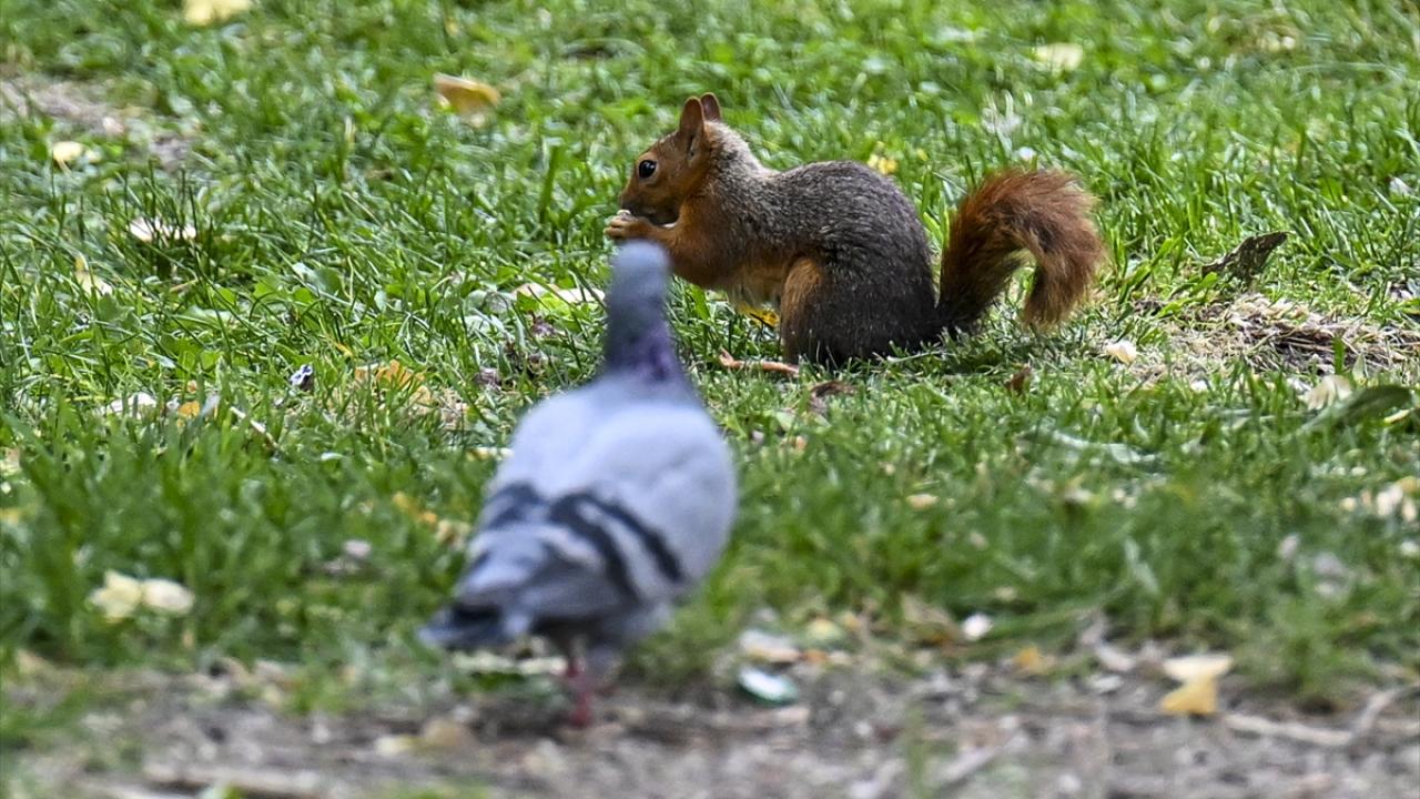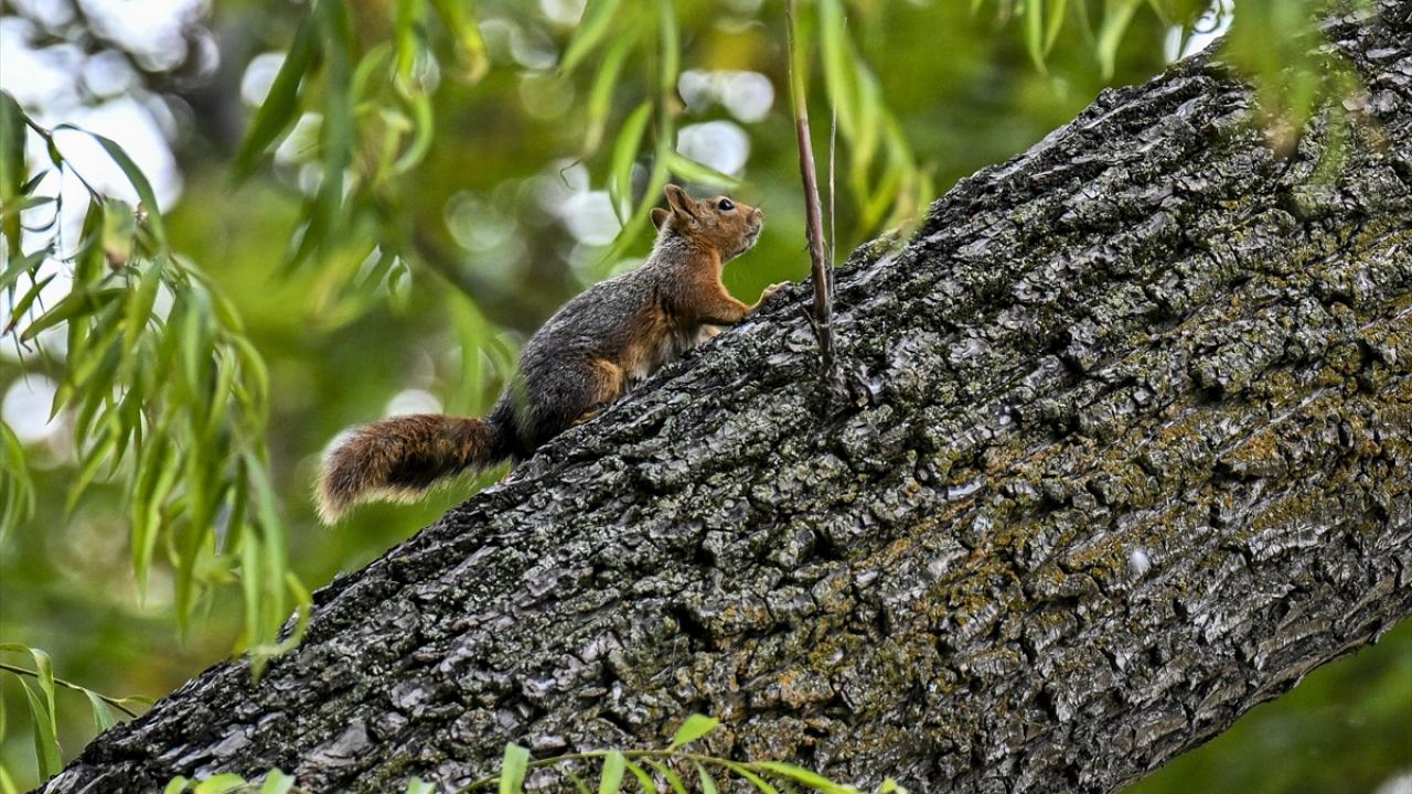 Gün içerisinde parktaki ağaçlarda bulunan yuvalarından ayrılarak yiyecek arayan sincaplar, güzel görüntü oluşturdu.