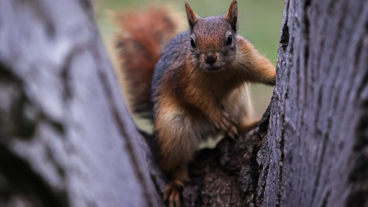 Gün içerisinde parktaki ağaçlarda bulunan yuvalarından ayrılarak yiyecek arayan sincaplar, güzel görüntü oluşturdu.