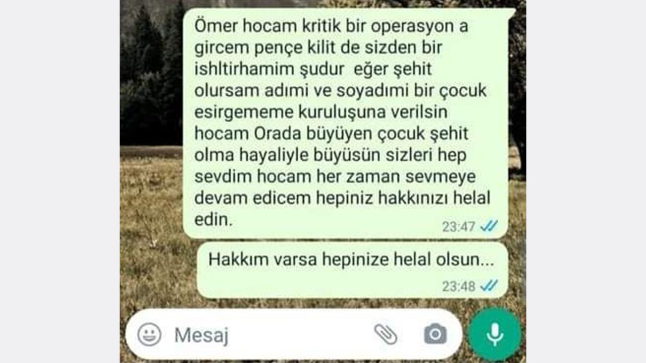 Özgül`ün göreve giderken, vasiyetini yetiştirme yurdundan öğretmeni ile paylaştığı ortaya çıktı. Uzman Çavuş Özgül, kritik bir operasyona gideceğini söyleyerek, "Eğer şehit olursam adım ve soyadım bir çocuk esirgeme kurumuna verilsin. Hocam orada büyüyen çocuklar şehit olma hayaliyle büyüsün." dedi. Helallik istedi.