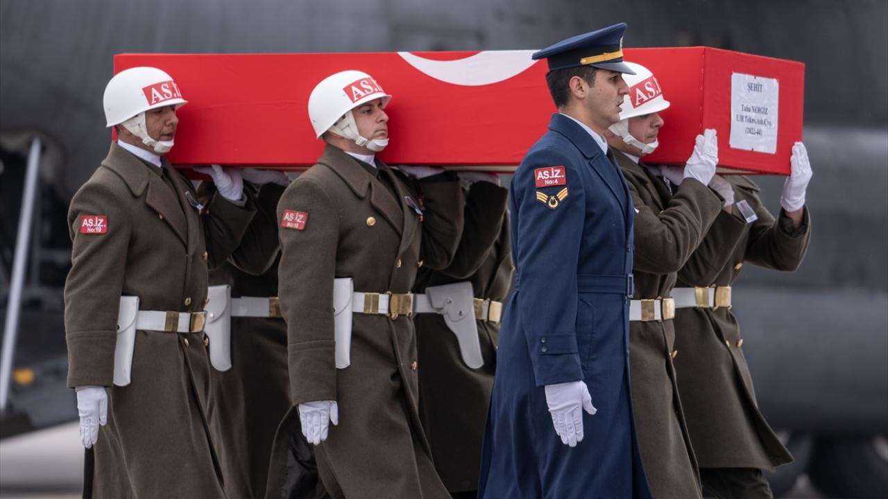 Süleyman Demirel Havalimanı`ndaki tören sonrası askeri uçakla Erzurum Hava Meydan Komutanlığına getirilen şehit Nergiz`in (23) Türk bayrağına sarılı naaşı, tören mangasınca alınıp bir süre omuzlarda taşınarak katafalka konuldu.