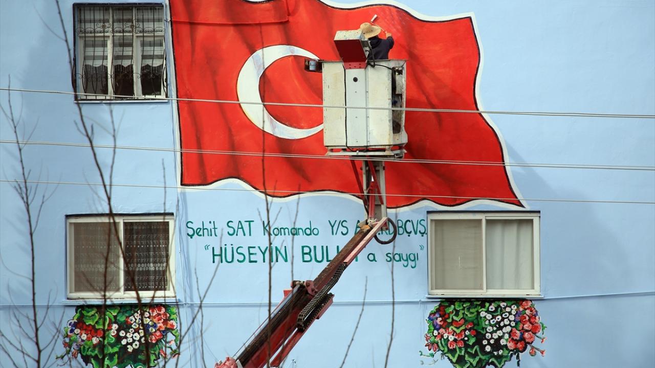 Şehit ailelerinin evlerine Türk bayrağı resmediliyor
