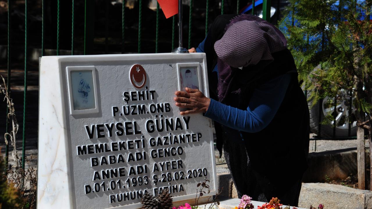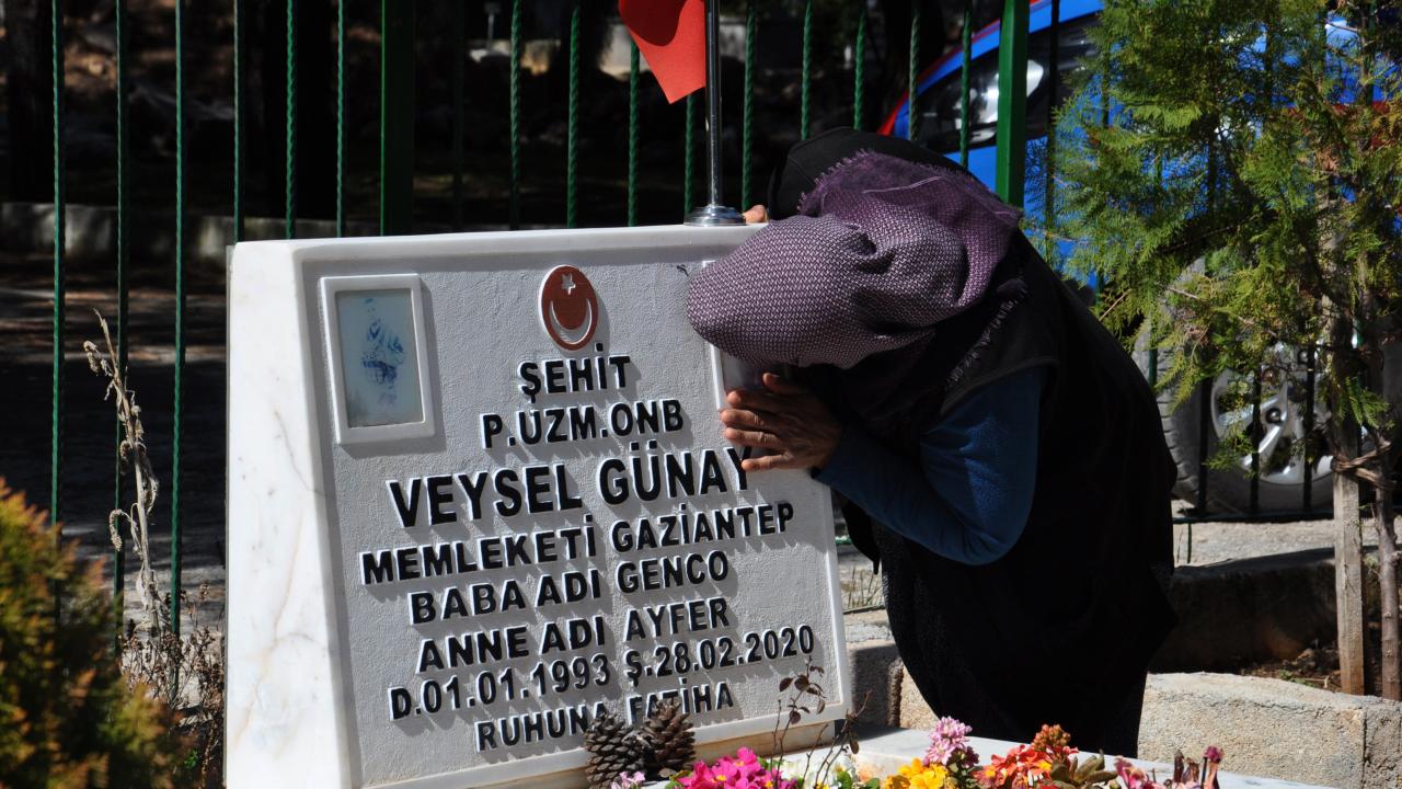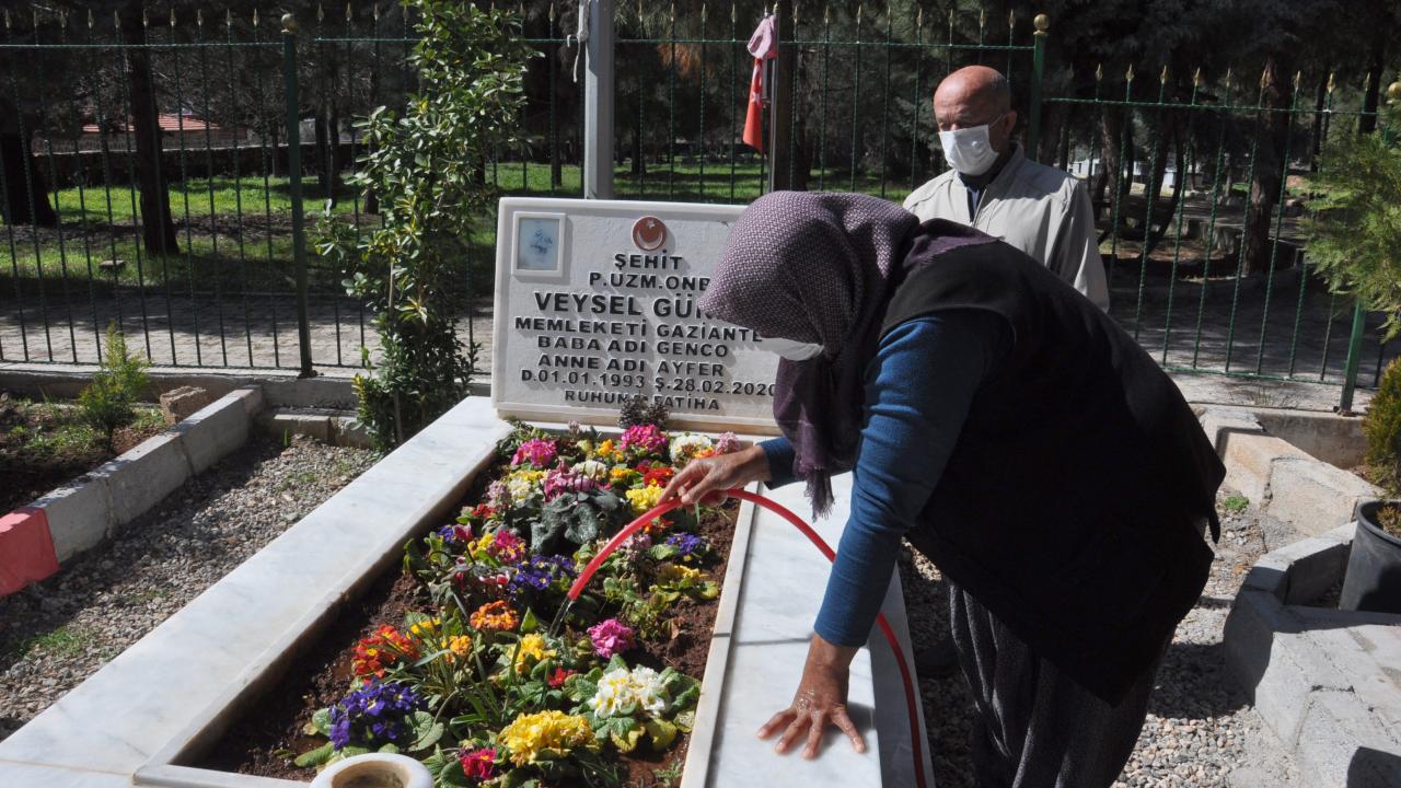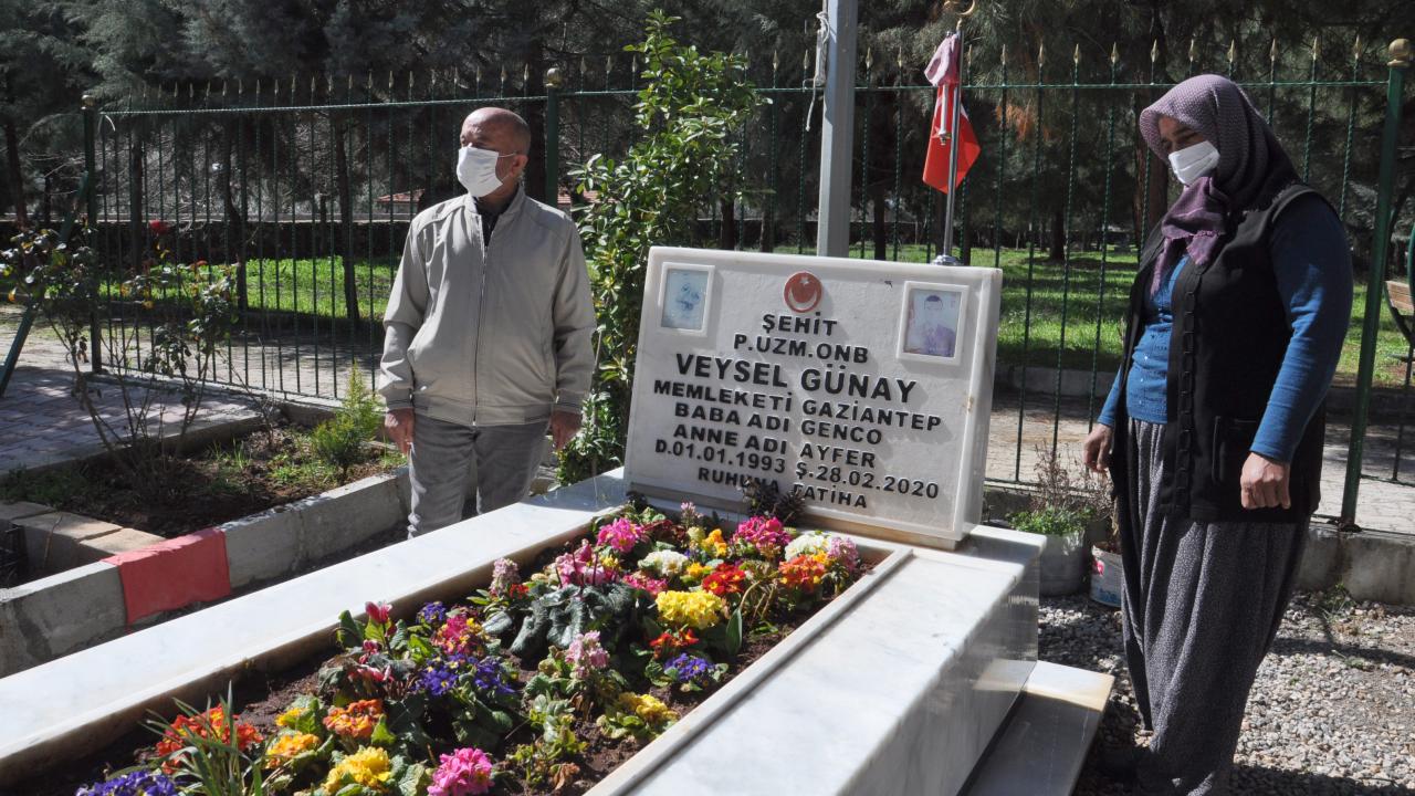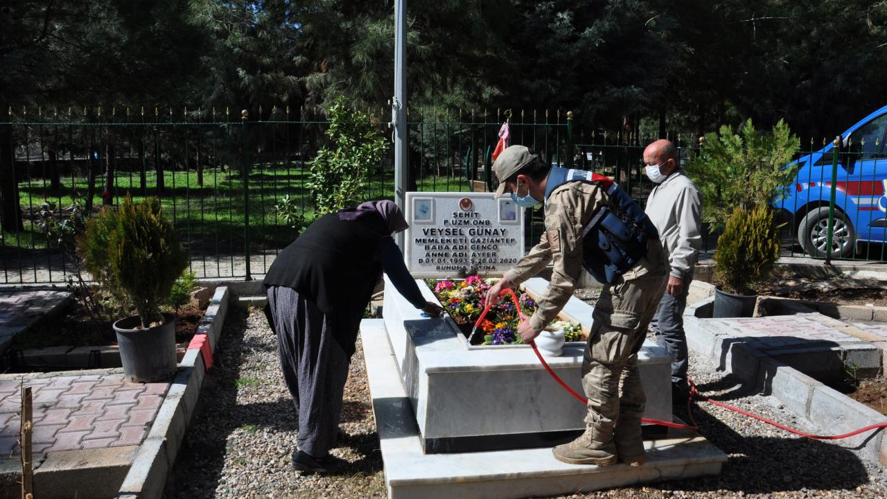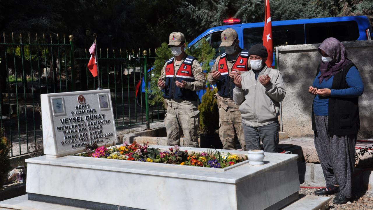 Gaziantep’in İslahiye ilçesinde, koronavirüs tedbirleri nedeniyle sokağa çıkamayan Ayfer ve Genco Günay, oğullarının şehadetinin birinci yıl dönümünde jandarmaların yardımıyla mezarlığa gitti.