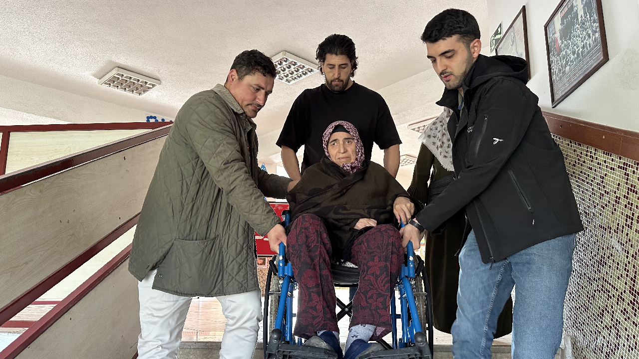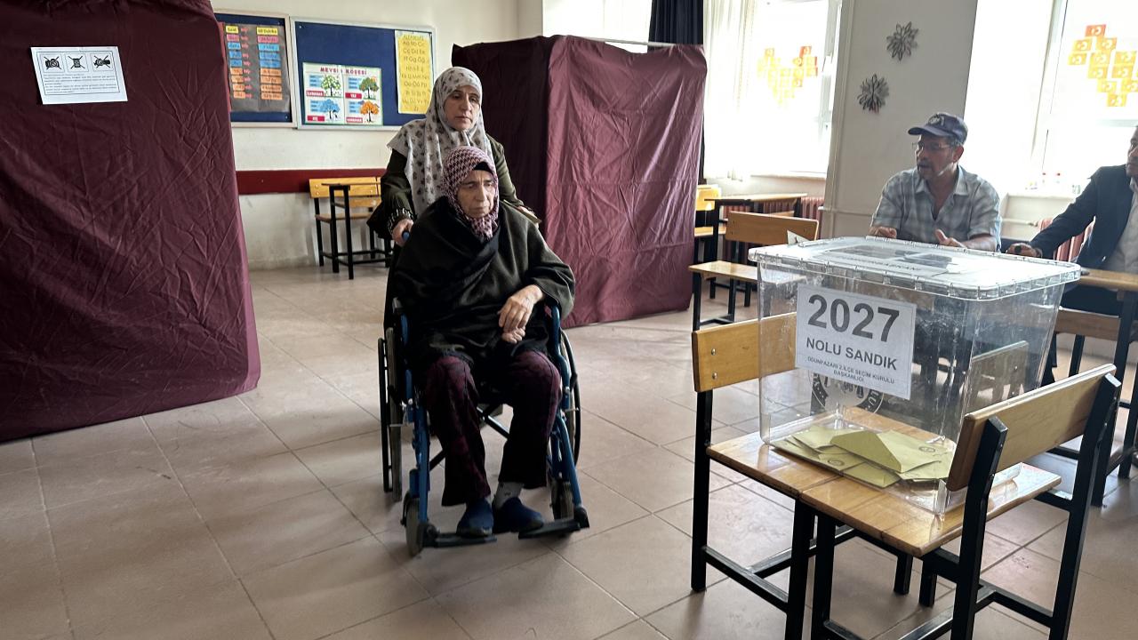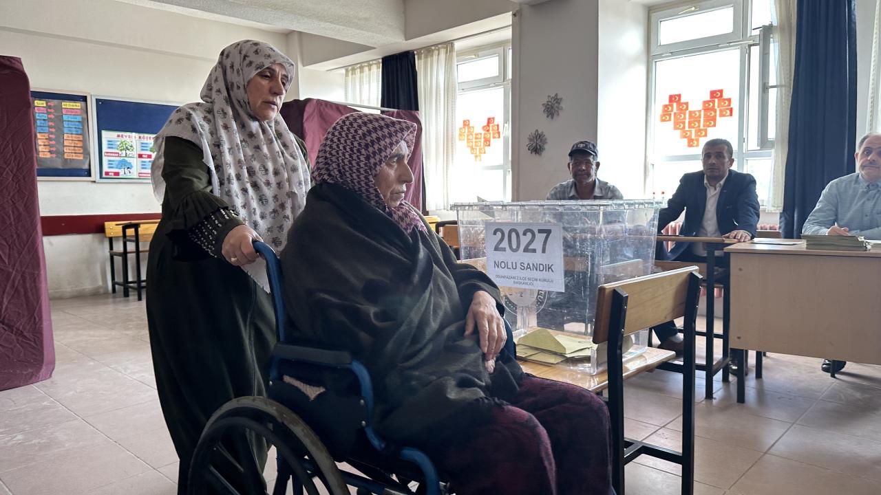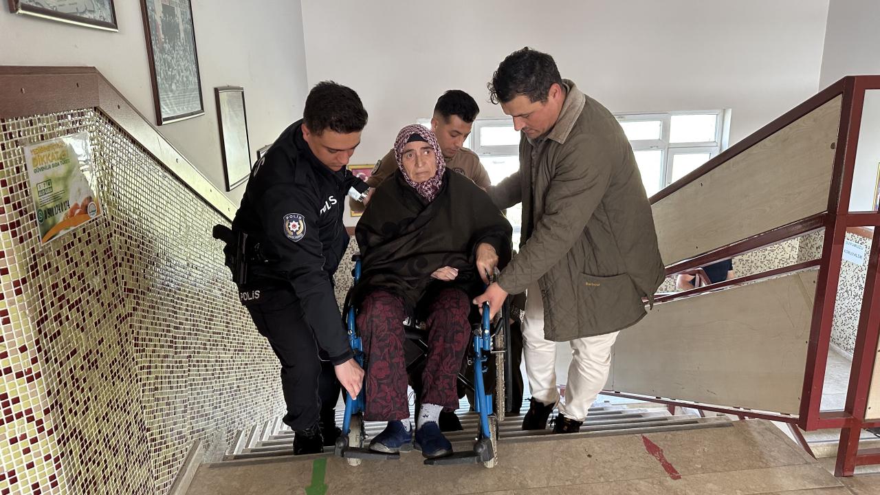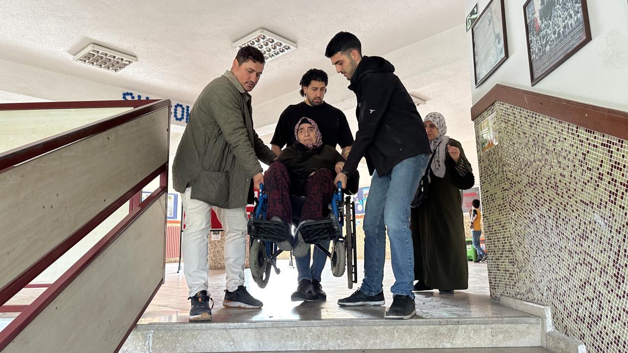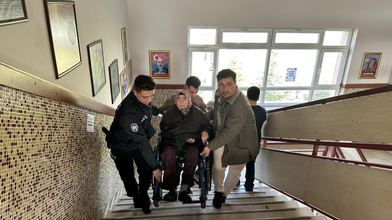 Kıbrıs şehidinin eşi 72 yaşındaki yürüme engeli bulunan Hanım Tekin, kolluk kuvvetleri ve vatandaşların yardımıyla sandık başına taşındı.