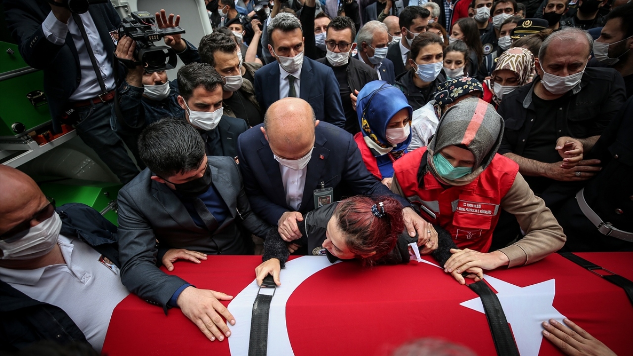 Gazi Orhanbey Camisi`nde düzenlenen törende Erman Özcan`ın eşi polis yeleği giyerek, şehidin tabutuna sarıldı.