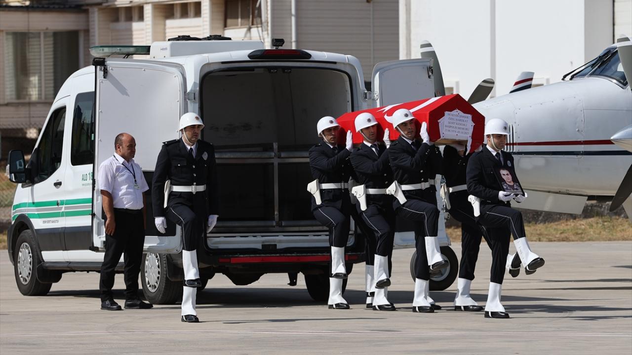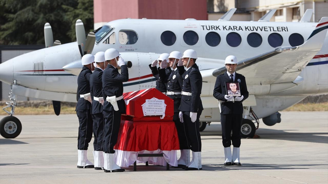 Özel harekat polislerinin omuzlarında taşıdığı Türk bayrağına sarılı tabut, tekbirler eşliğinde uçağa götürüldü.