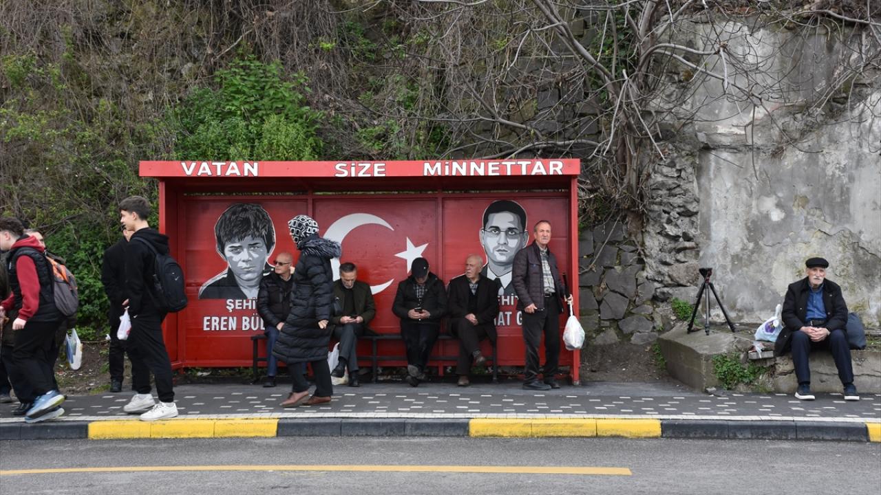Büyükşehir Belediyesinin organizesinde hazırlıklarını tamamlayan Melisa ve Ufuk Kaman, Maçka ilçesi kırsalında 11 Ağustos 2017`de bölücü terör örgütü mensuplarıyla sağlanan sıcak temas sırasında şehit olan 15 yaşındaki Eren Bülbül ve Jandarma Astsubay Kıdemli Başçavuş Ferhat Gedik`in resimlerini de mahalledeki otobüs durağına çizdi.