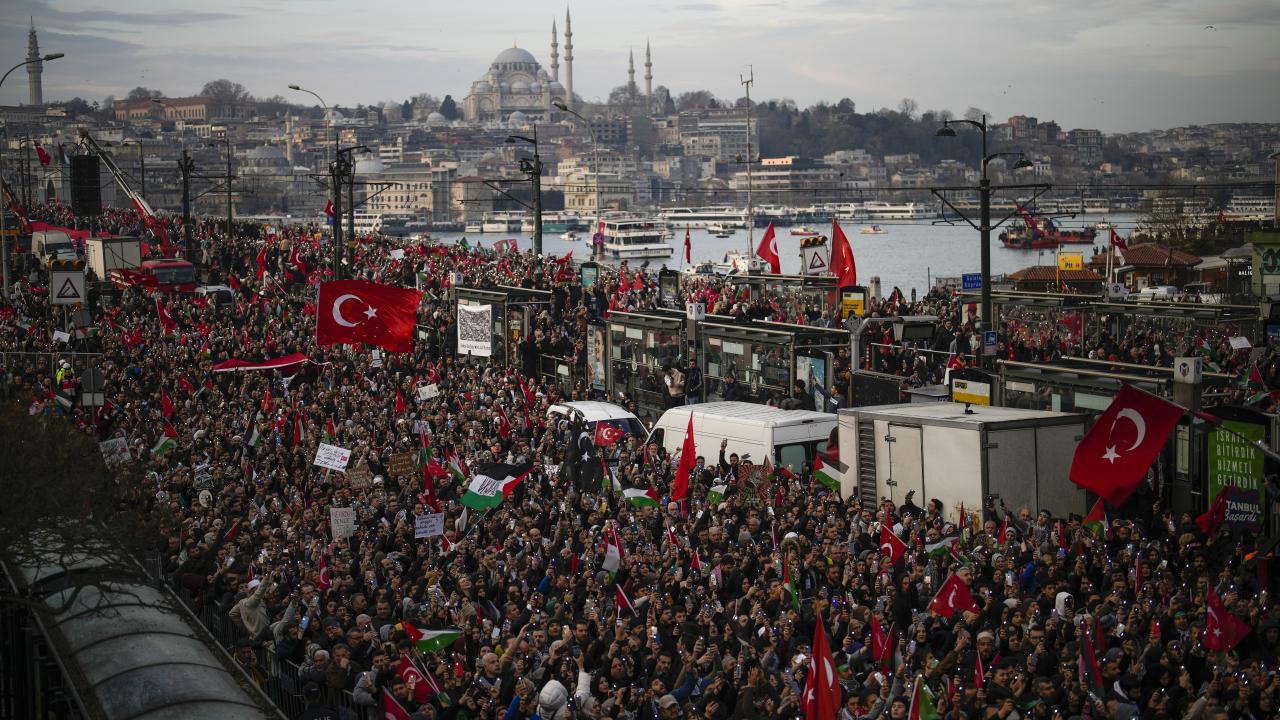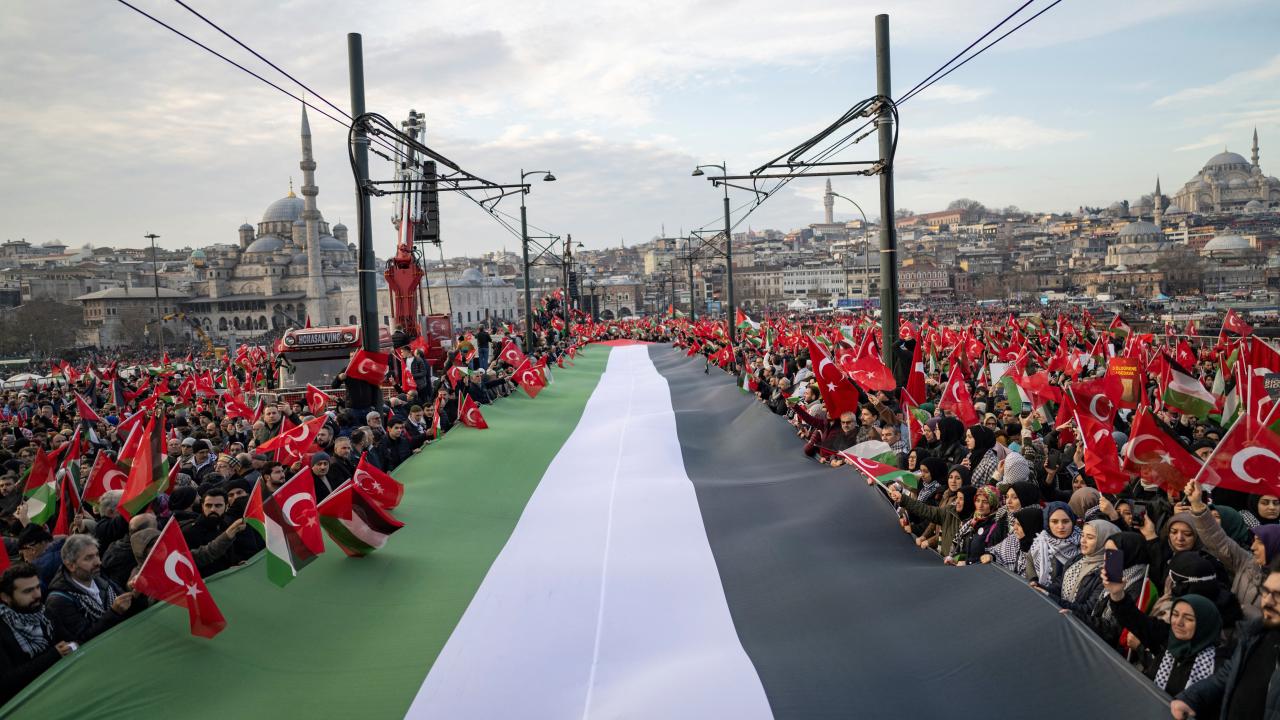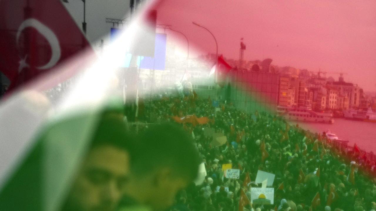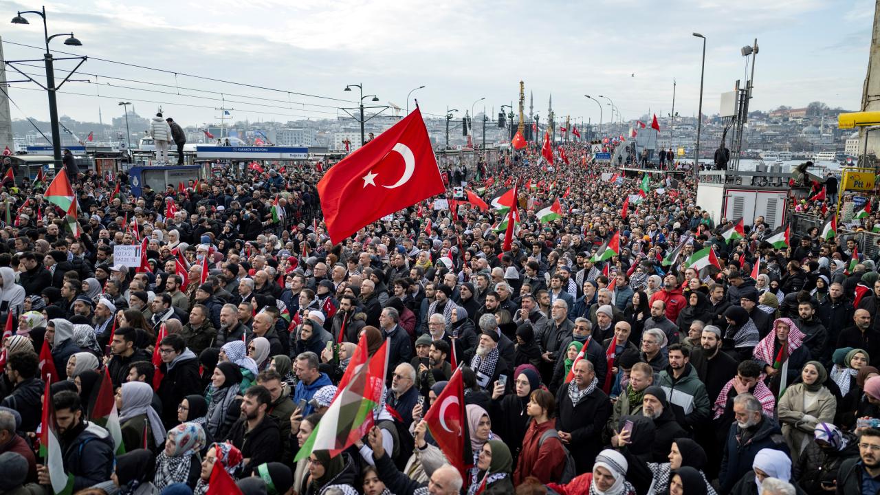 Türkiye Gençlik Vakfının (TÜGVA) öncülüğünde, Milli İrade Platformu tarafından 308 STK`nin katılımıyla düzenlenen "Şehitlerimize Rahmet, Filistin`e Destek, İsrail`e Lanet" yürüyüşü için Galata Köprüsü`nde yüz binlerce kişi bir araya geldi.