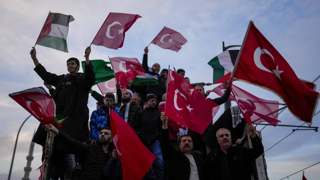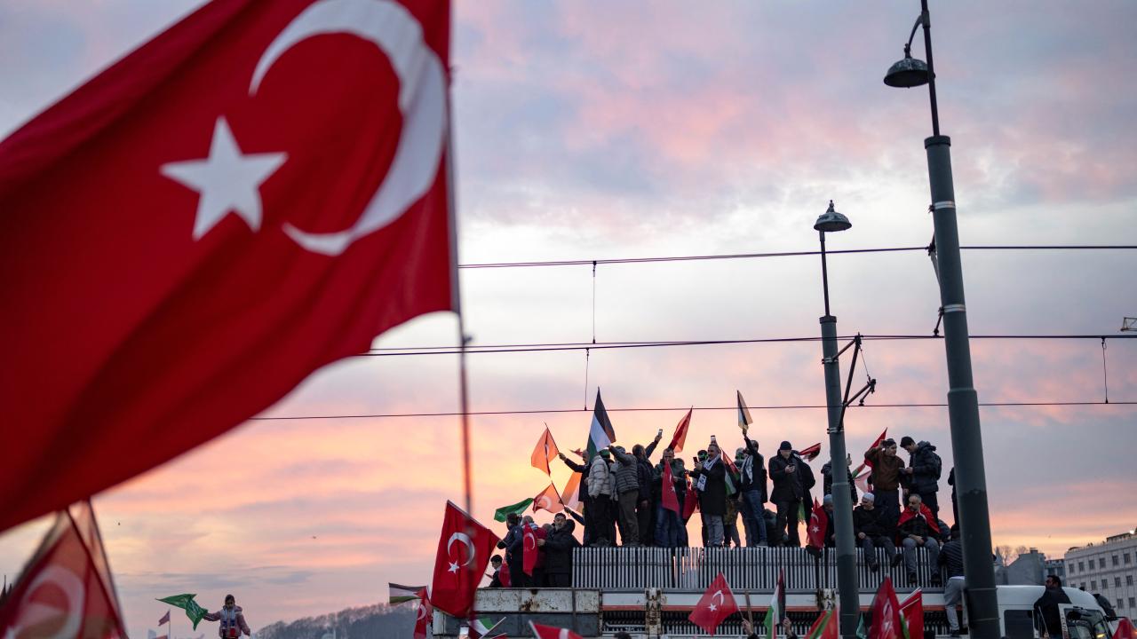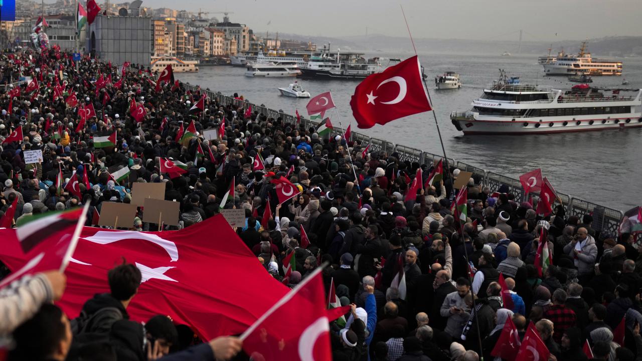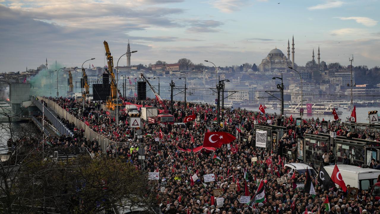 Türkiye Gençlik Vakfının (TÜGVA) öncülüğünde, Milli İrade Platformu tarafından 308 STK`nin katılımıyla düzenlenen "Şehitlerimize Rahmet, Filistin`e Destek, İsrail`e Lanet" yürüyüşü için Galata Köprüsü`nde yüz binlerce kişi bir araya geldi.