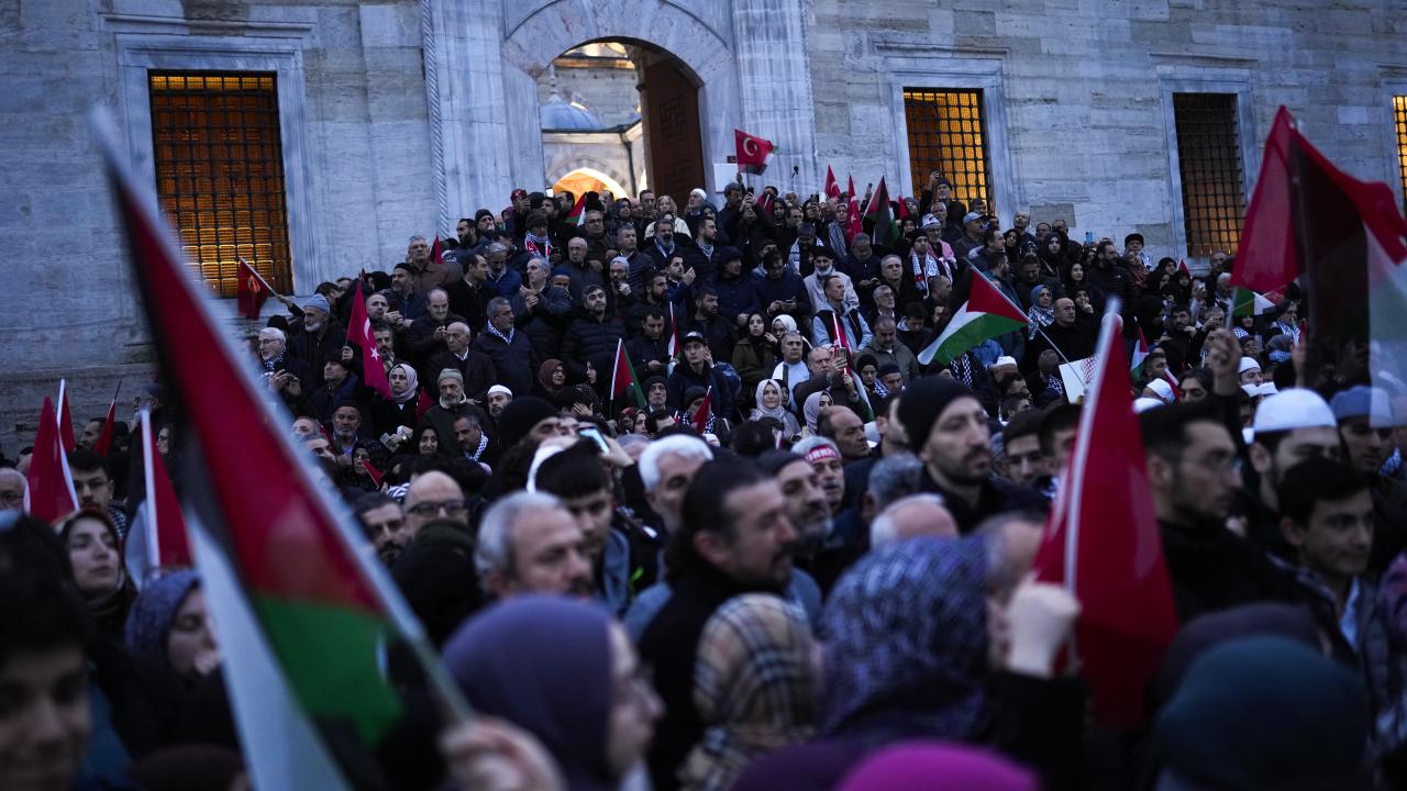 Namaz sonrası Ayasofya Meydanı`nda toplanan katılımcılar ise "Şehitler ölmez vatan bölünmez", "İşbirlikçi hainler hesap verecek, katil İsrail hesap verecek", "Katil İsrail Filistin`den defol", "Kanımız canımız feda olsun Aksa`ya", "Hamas’a selam direnişe devam" sloganları attı.