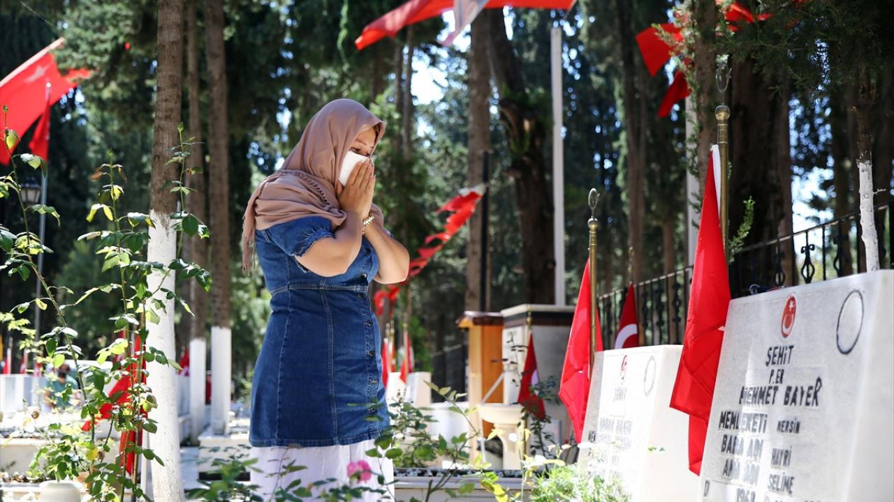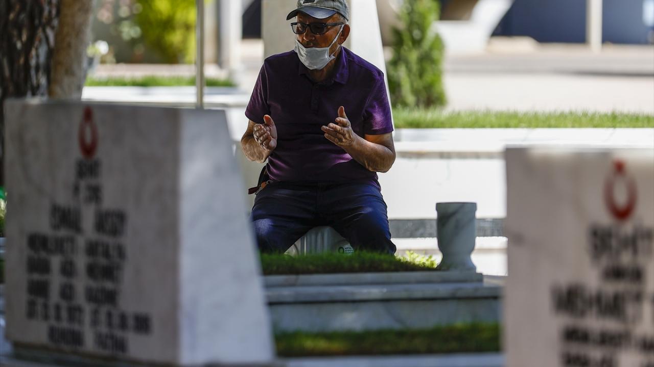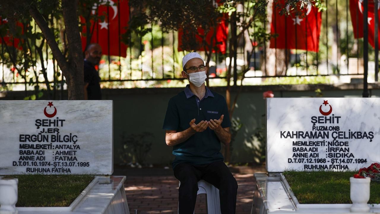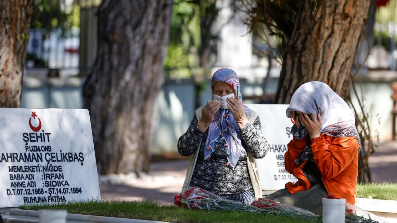 Sokağa çıkma kısıtlamasından muaf tutulan şehit aileleri, Ramazan Bayramı arifesinde yakınlarının kabirlerinde Kur'an-ı Kerim okuyup dualar etti.