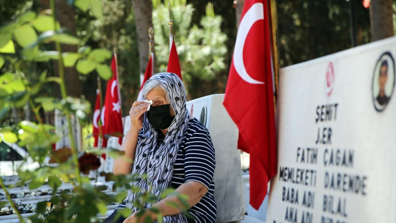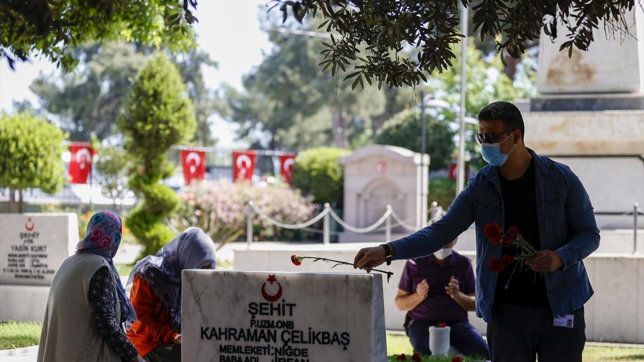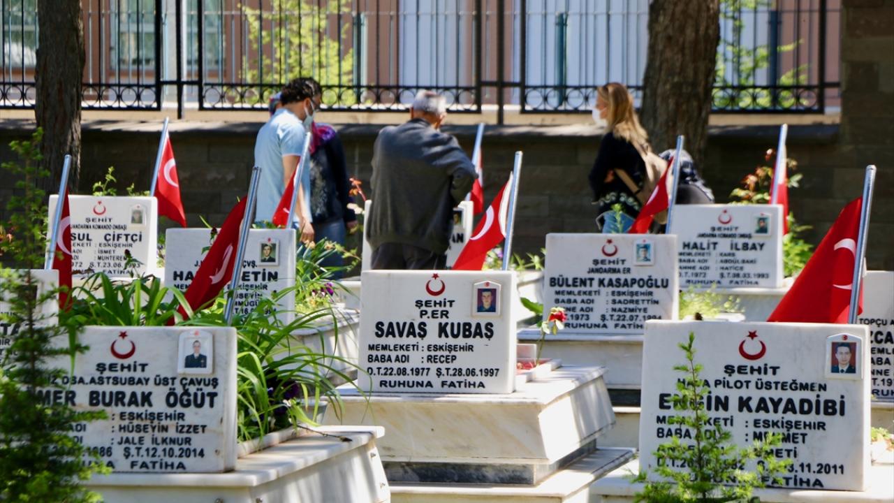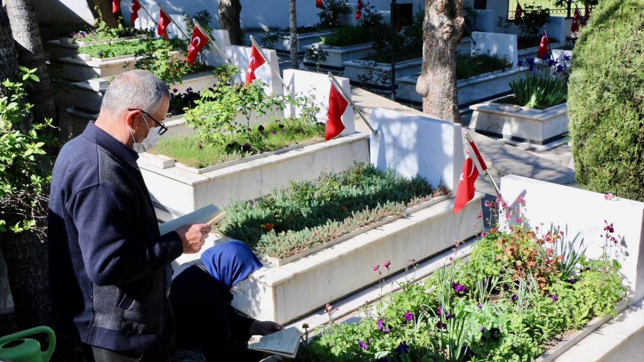 Sokağa çıkma kısıtlamasından muaf tutulan şehit aileleri, Ramazan Bayramı arifesinde yakınlarının kabirlerinde Kur'an-ı Kerim okuyup dualar etti.