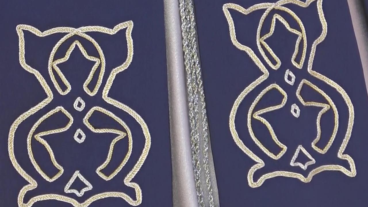 Tulumun üzerine saten kumaş üzerine makine nakışı işlenirken, başlık metal aparatlarla süslendi. Çifte Minareli Medrese`nin girişinin sağ tarafındaki bulunan revak sütunun üzerindeki geometrik desen rumi, palmet ve lotus çiçeği motifleri kıyafetlere işlendi. Motifler, yüksek kabartma tekniği ile kıyafetlere uygulandı.
