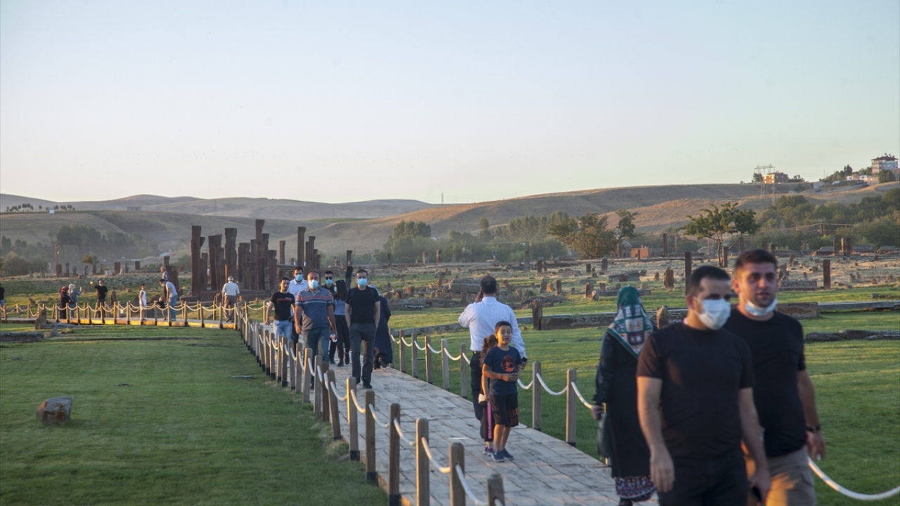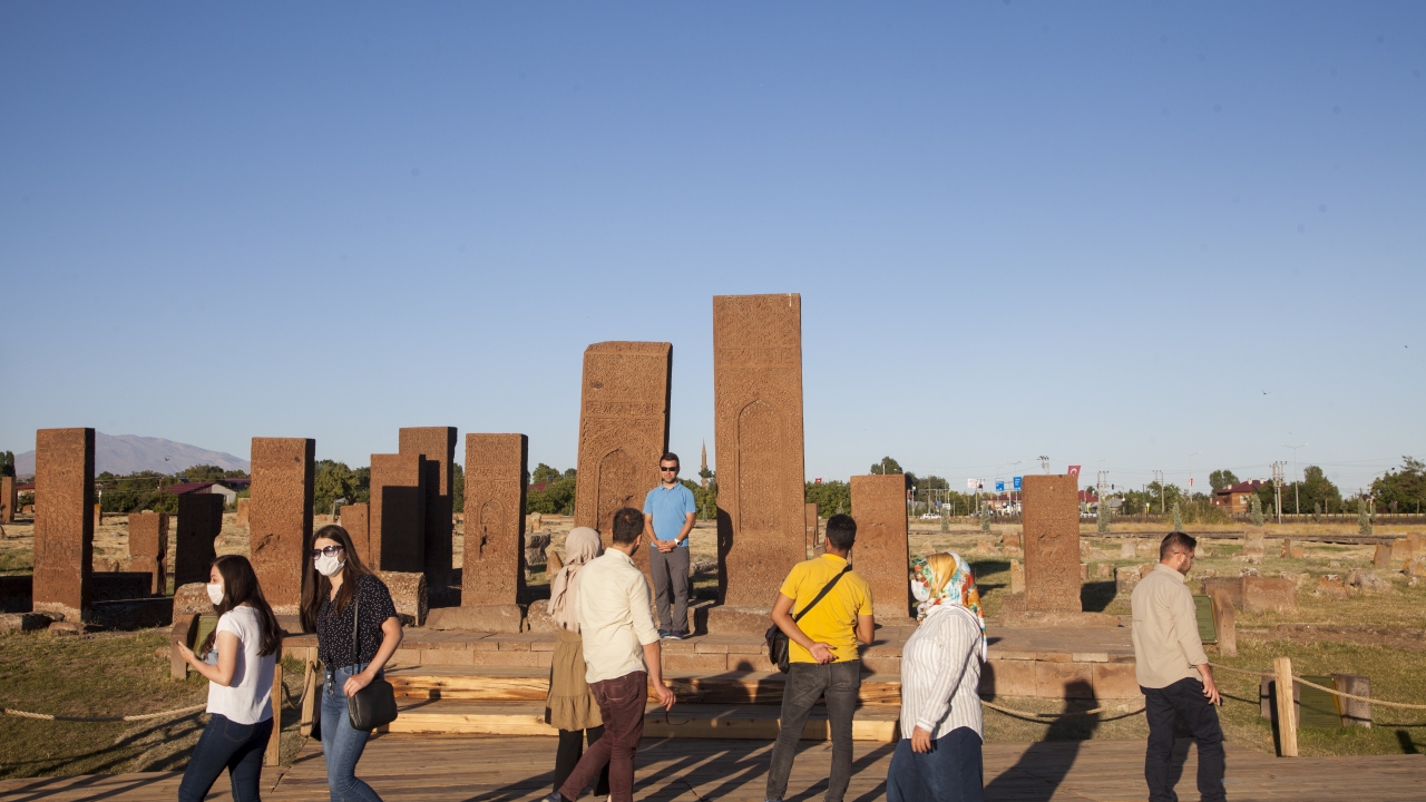 Cumhurbaşkanlığının himayesinde, Kültür ve Turizm Bakanlığının izniyle kazı çalışmaların devam ettiği mezarlığa gelen ziyaretçiler, şehitler için dua ediyor, üzerlerindeki yazılar, kabartmalar ve oymalarıyla birbirinden değerli 8 bin 200 mezar taşının bulunduğu alanda fotoğraf çektiriyor.